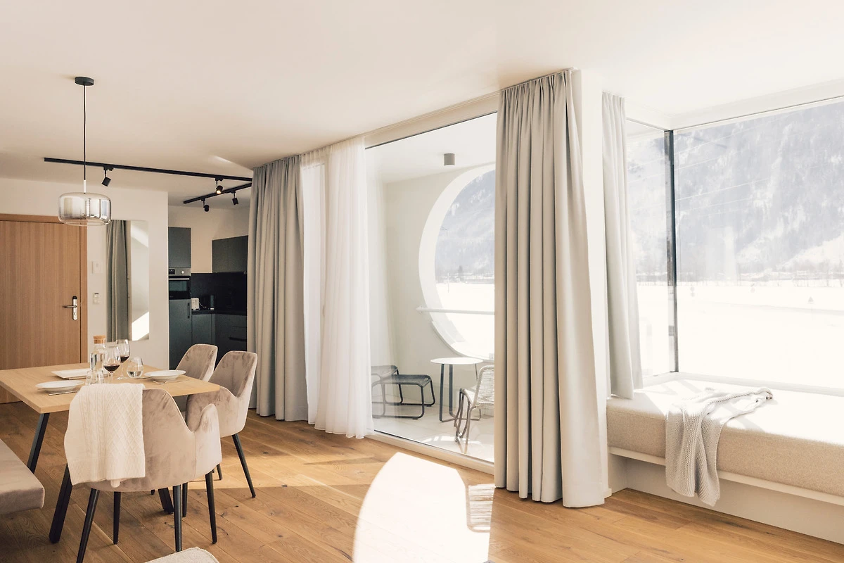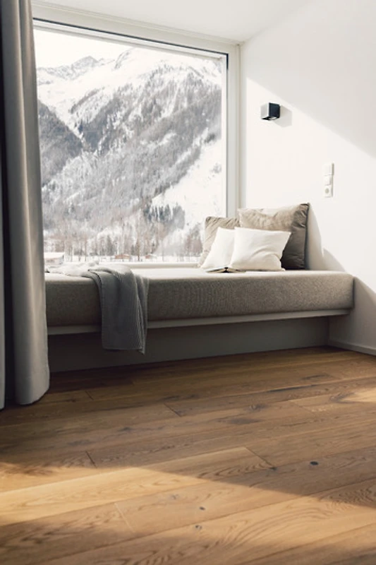 Panoramagenuss zu jeder Jahreszeit. Auf dem Balkon, von dem Sie Berge bestaunen. Im grosszügigen Wohnraum mit Panoramafenster & Sit-Window, von dem Sie mit Ihren Gedanken bis zu den Gipfeln reisen. Und darüber hinaus.