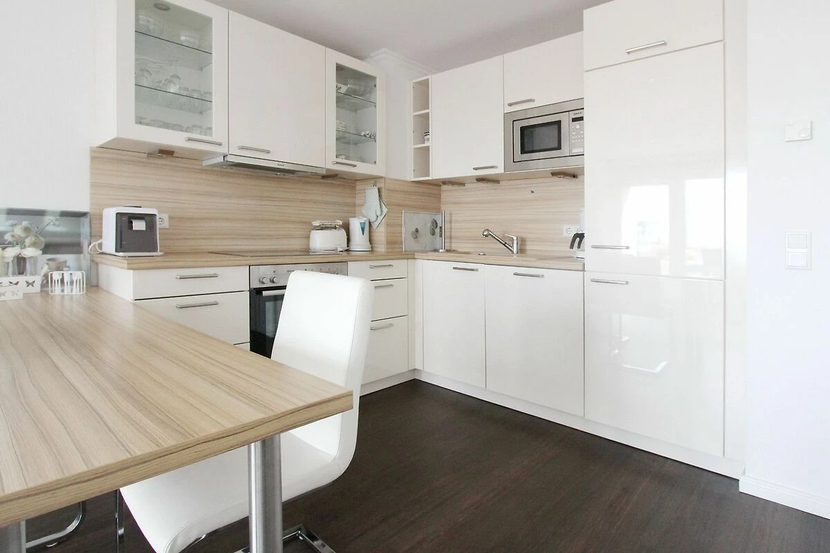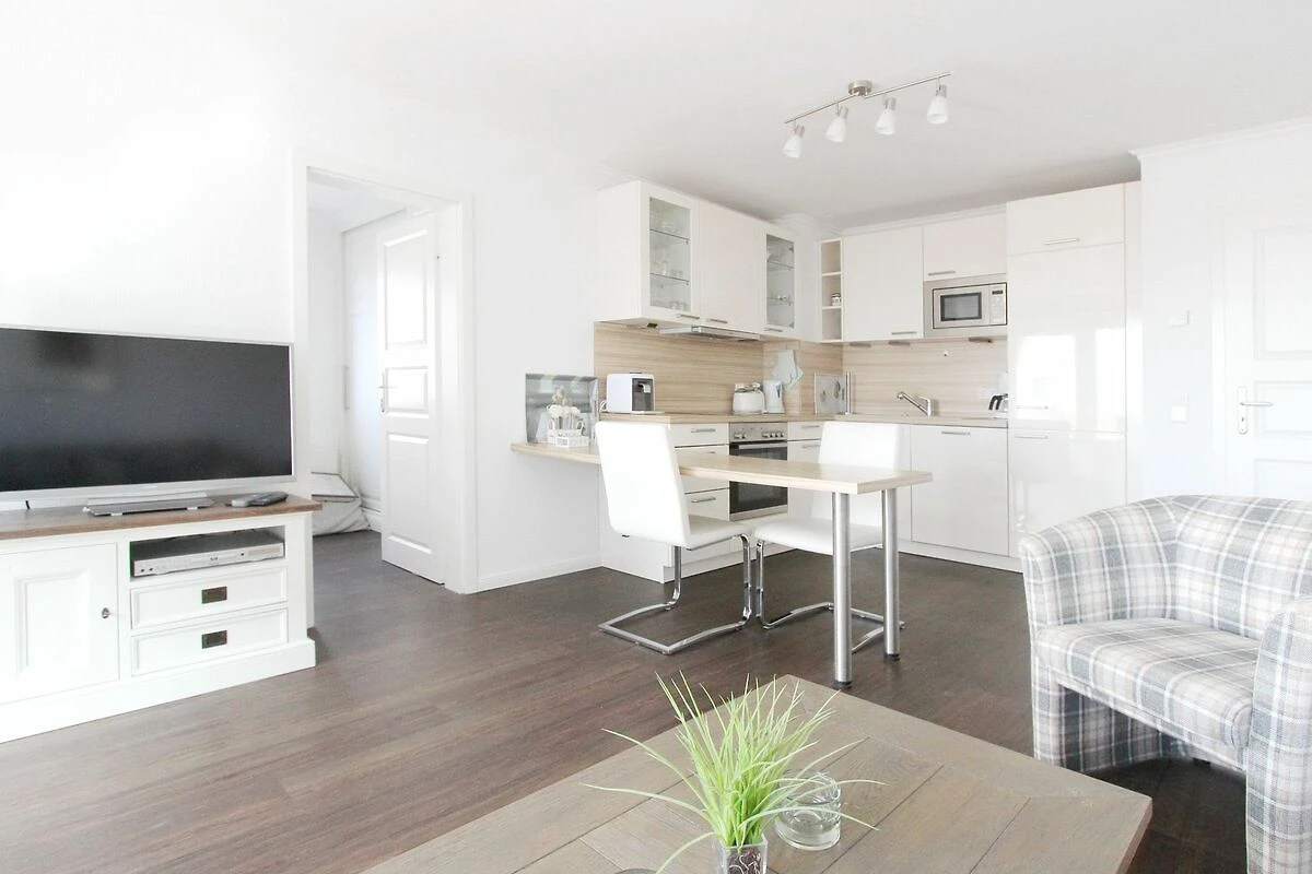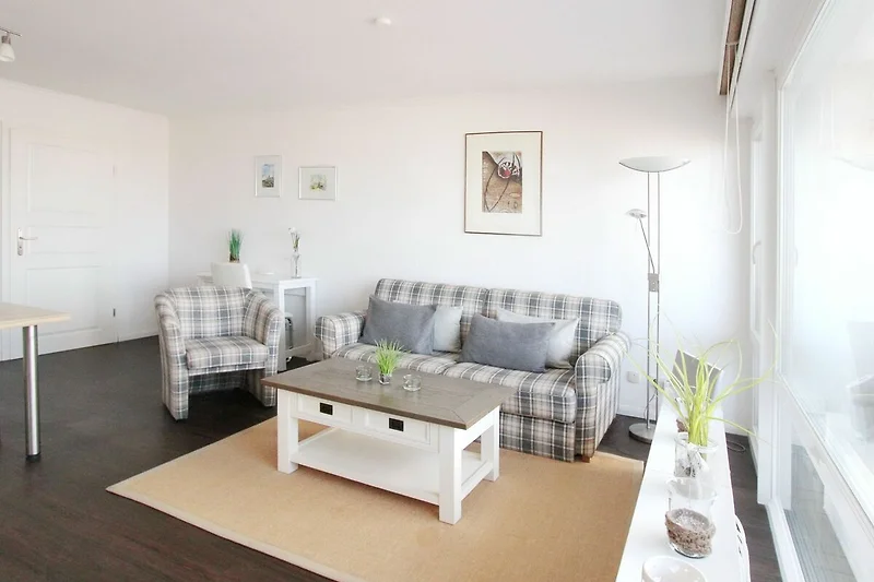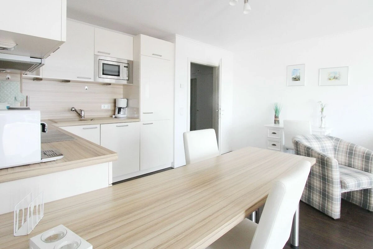 Gemütliche 2 Zimmerwohnung in der 3. Etage im Haus Westerhörn im Beach House Stil wenige Schritte vom Strand entfernt. Hell und freundlich eingerichteter Wohnraum mit vorgelagertem Westbalkon, kleines Meerblickchen inklusive. In der Wohnung steht ihnen eine grosse Couch und ein Fernsehsessel zur Verfügung, sowie ein Schreibtisch zum erledigen ihrer Urlaubspost und ein Essplatz mit 2 Stühlen. In der offenen Küchenbar mit Backofen, Ceranfeld, Mikrowelle, zusätzlicher Kaffeekapselmaschine und Spülmaschine können sie sich selbst verpflegen. Das separate Schlafzimmer verfügt über ein Doppelbett und einen grossen Kleiderschrank mit viel Stauraum. Designfussboden in Holzoptik wurde in der ganzen Wohnung verlegt. Im hellen Badezimmer gibt es eine Dusche und einen Handtuchtrockner. Zur technischen Ausstattung der Wohnung gehört: ein Flachbildfernseher, ein DVD Player, eine IPod Station und ein Radio. Freies WLAN ist kostenfrei vorhanden (die Zugangsdaten stehen auf der Telekom Speedbox). Wohnungsgrösse: ca. 45 m².