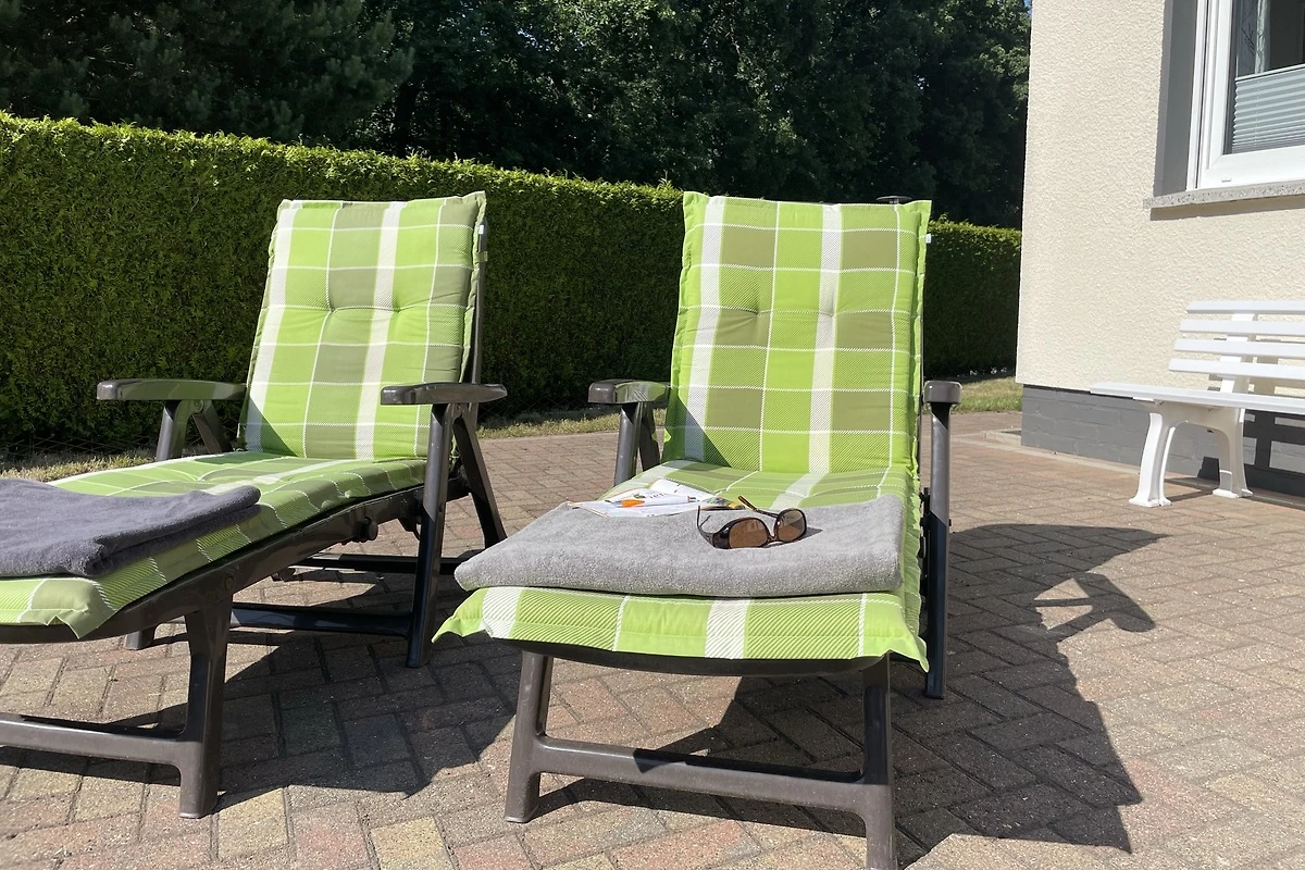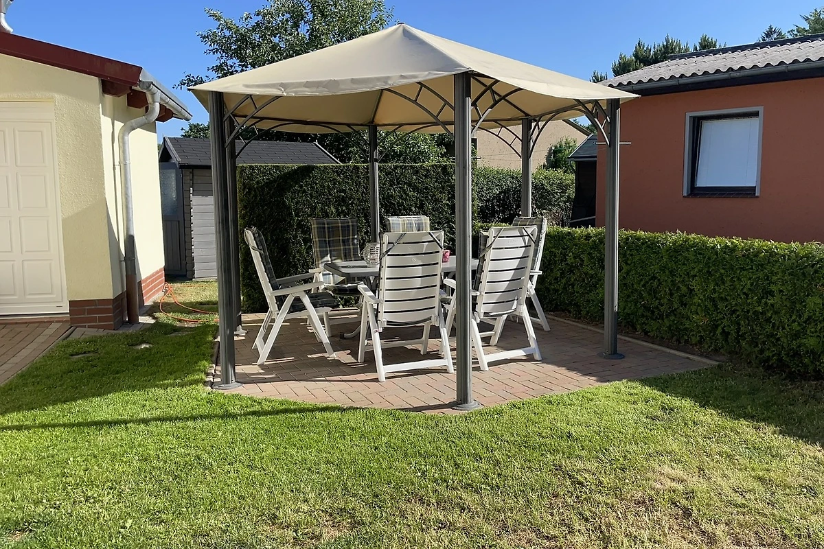 Gartenmöbel,Gartenliegen, Sonnenschirme, Pavillion und Grill stehen für Ihren Urlaub zur Verfügung.