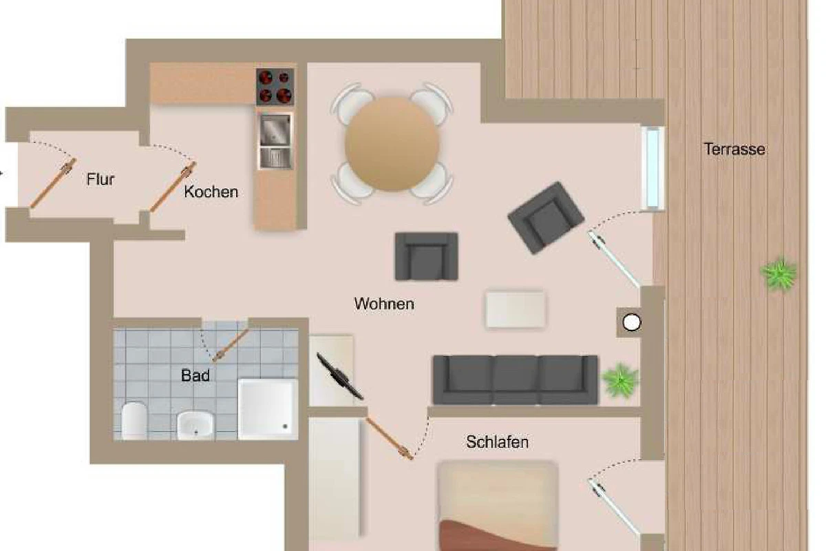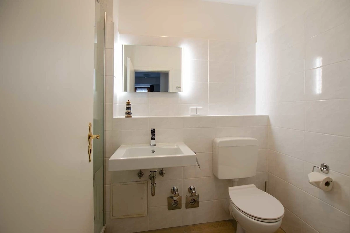 Die FeWo liegt im Erdgeschoss und verfügt über ein gemütliches Schlafzimmer mit Doppelbett (180 cm x 200 cm), Spiegelschrank sowie 2 Nachttischen. Ausserdem gibt es ein Bad mit WC und Dusche, ein Wohnzimmer mit Schlafsofa (145cm x 195cm), 2 Sesseln sowie einem Couchtisch.