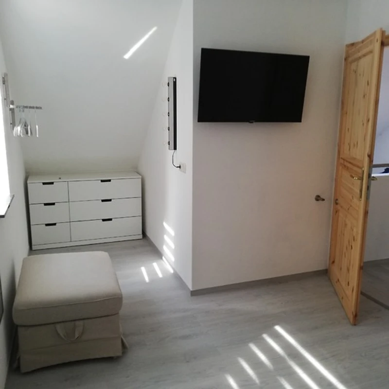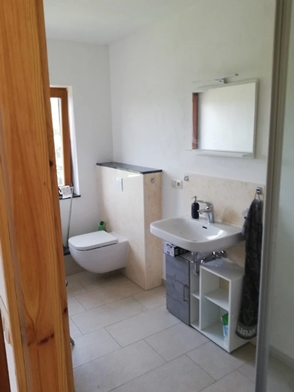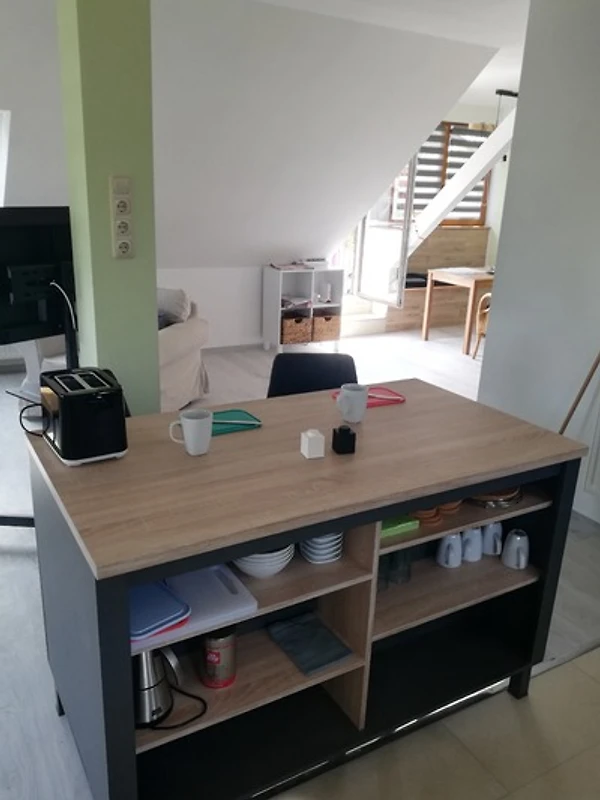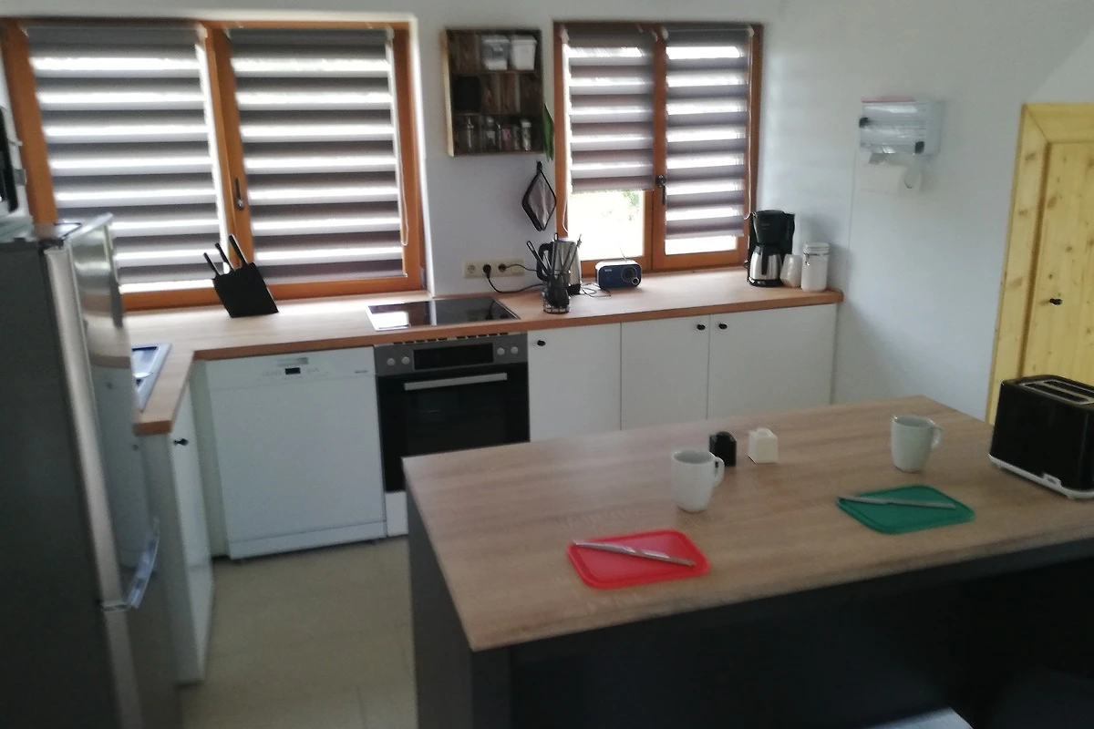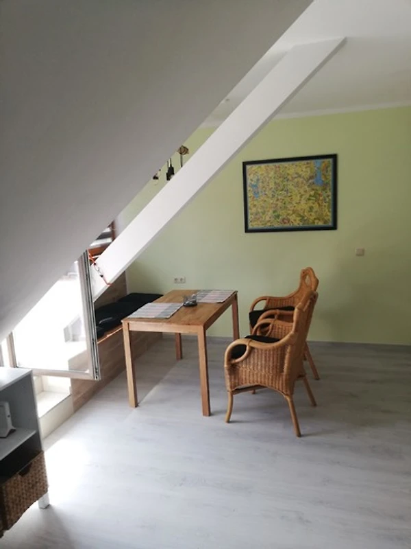 Sehr ruhige, mitten im Dorf liegende Ferienwohnung zu vermieten. Die Wohnung mit einem separaten Schlafzimmer (1,40m Doppelbett) und einer ausziehbaren Schlafcouch (1,40m) im Wohnbereich ist für 3 Personen geeignet . Wohnzimmer/Küche (mit Tresen) und einer Essecke bilden ein grossen L . Modernes Badezimmer mit Fussbodenheizung und Dusche. Sat TV (im Wohnzimmer auf Ständer beweglich, im Schlafzimmer Wandmontage) und kostenfreies WLAN sind vorhanden. Die Küche ist ausgestattet mit Kühlschrank, Geschirrspüler, Kaffeemaschine, Herd, Backofen, Mikrowelle, Toaster. Eine eigene Waschmaschine steht im Aufgangsbereich zur Verfügung und auf der sehr grossen Dachterrasse (45 qm) kann man sich entspannen und grillen.