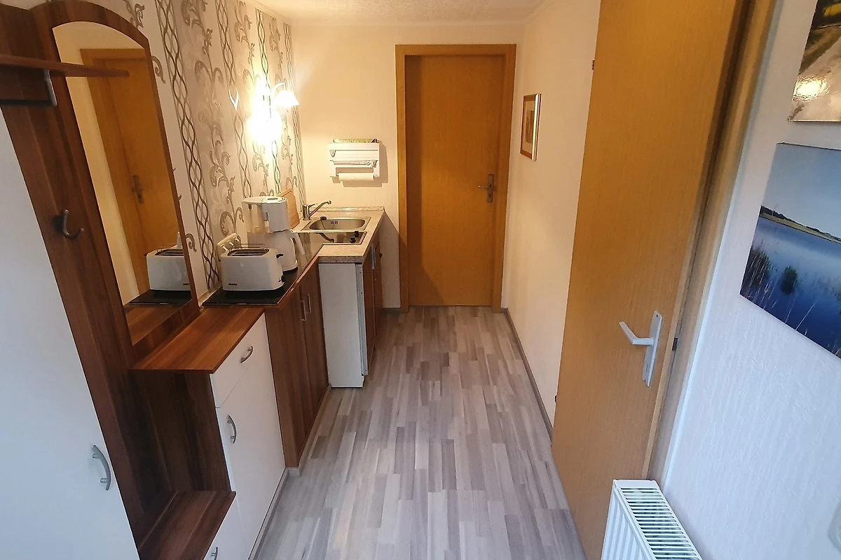 Die offene Küche hat einen Kühlschrank, eine 2er Herdplatte, Kaffeemaschine, Toaster, Wasserkocher und einen MiniBackofen.