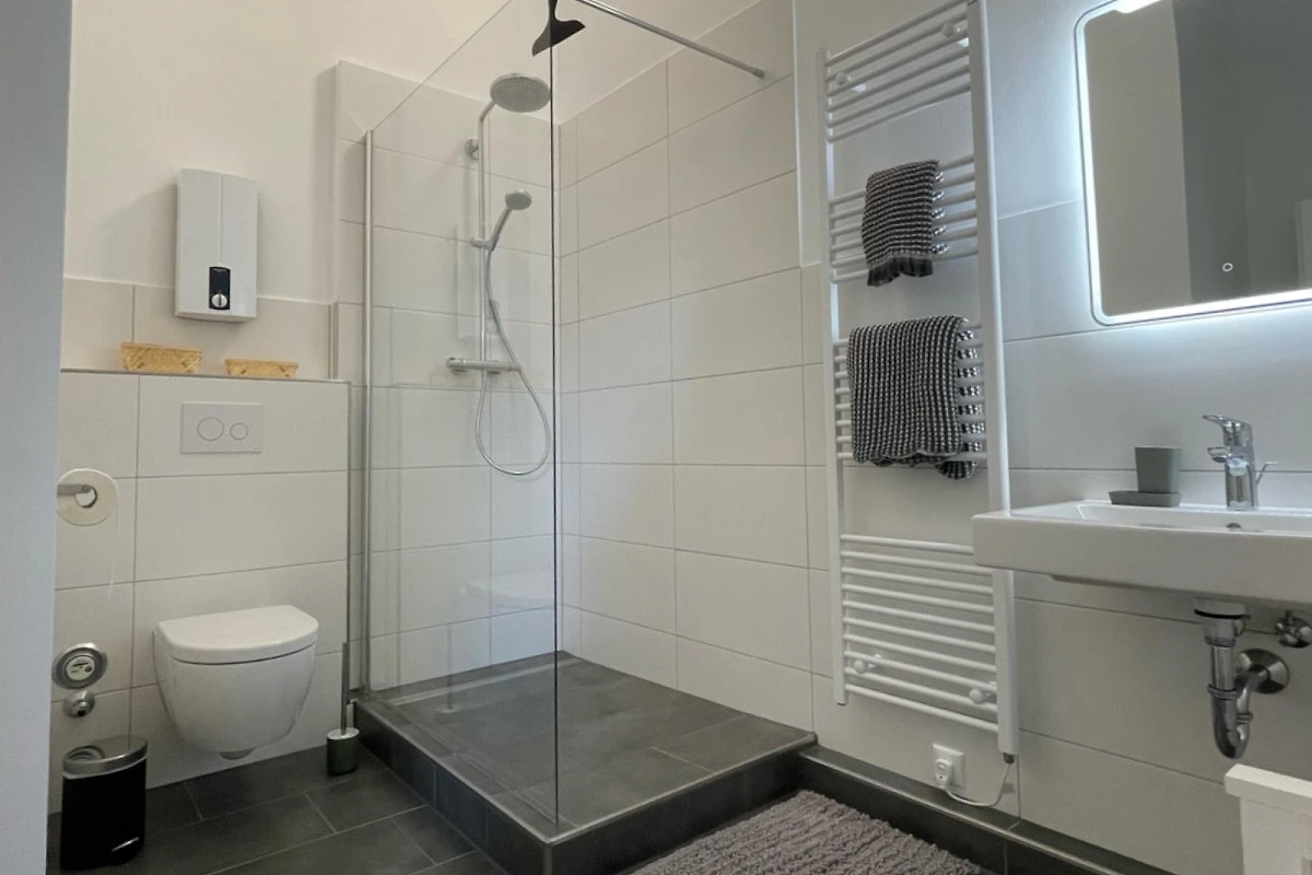 Als letztes Zimmer begrüsst Sie noch das geschmackvoll eingerichtete Badezimmer mit grosser Regendusche und Waschbecken.