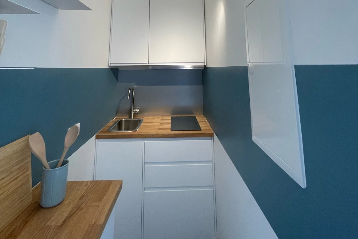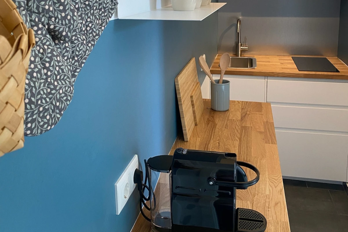 Angrenzend an den Wohnbereich befindet sich die Küche, mit einer modernen Küchenzeile, die alles für den täglichen Bedarf bereithält wie z.B. eine Kaffee-Kapselmaschine und ein Induktionskochfeld.