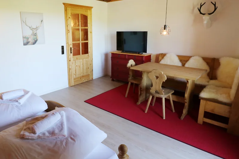 - 1 Wohn-/Schlafzimmer mit Doppelbett, TV, Essplatz und Aufgang zum Matratzenlager