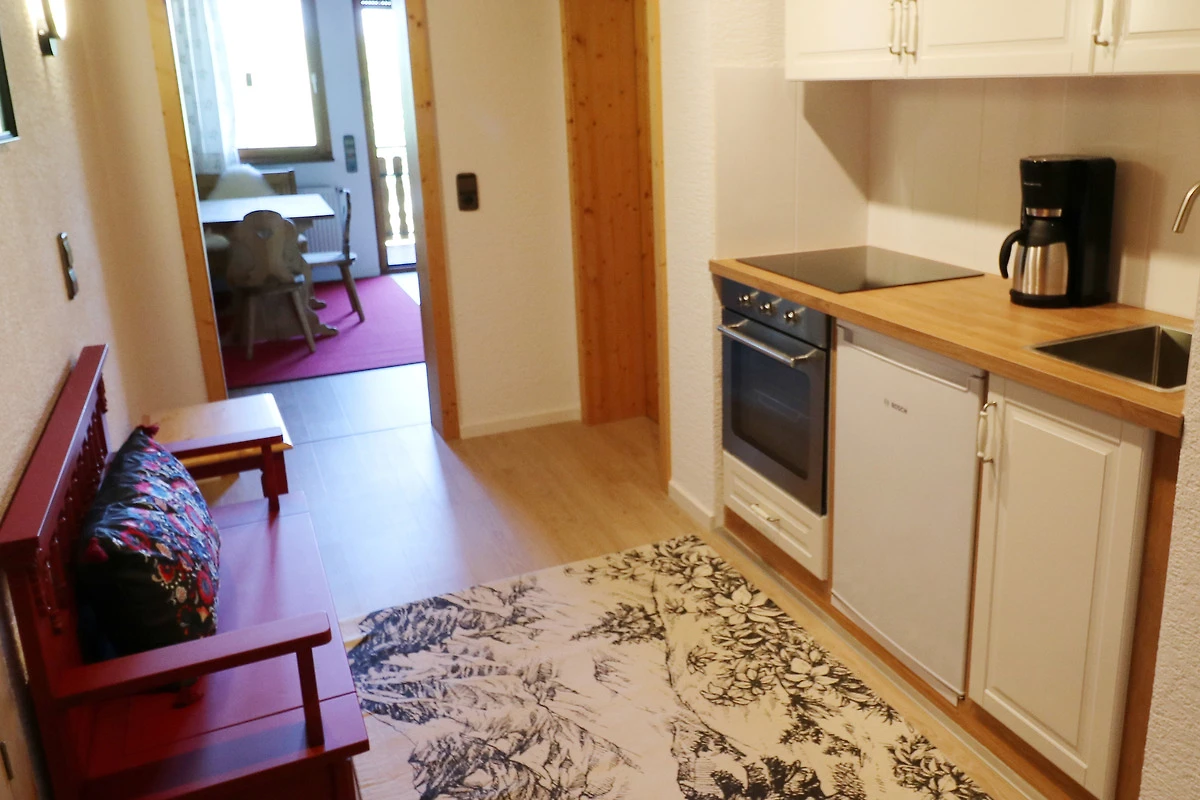 - 1 vollausgestattete Küchenzeile mit Herd mit 4 Kochfeldern, Kühlschrank mit Gefrierfach, Filterkaffeemaschine, Backofen, Toaster