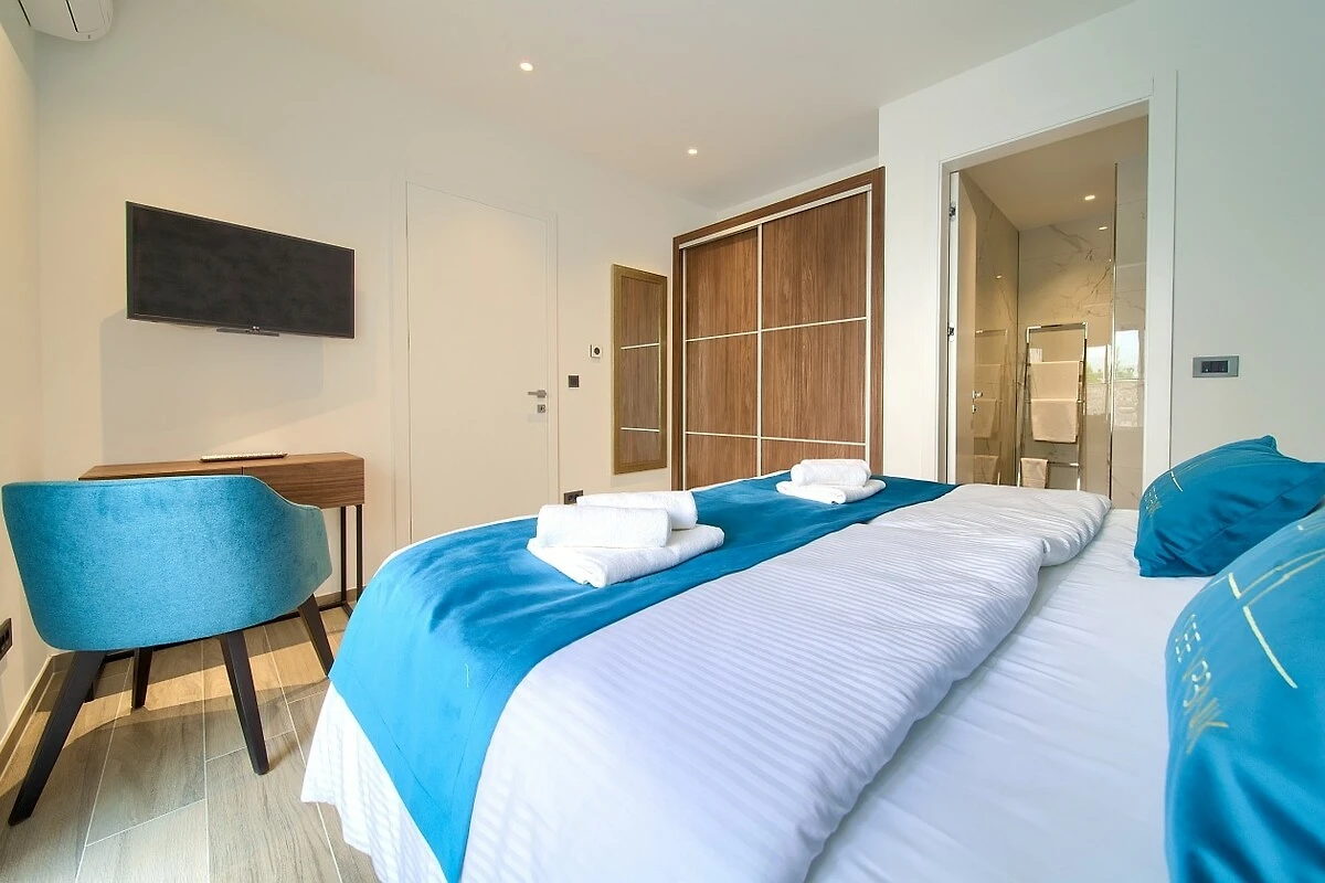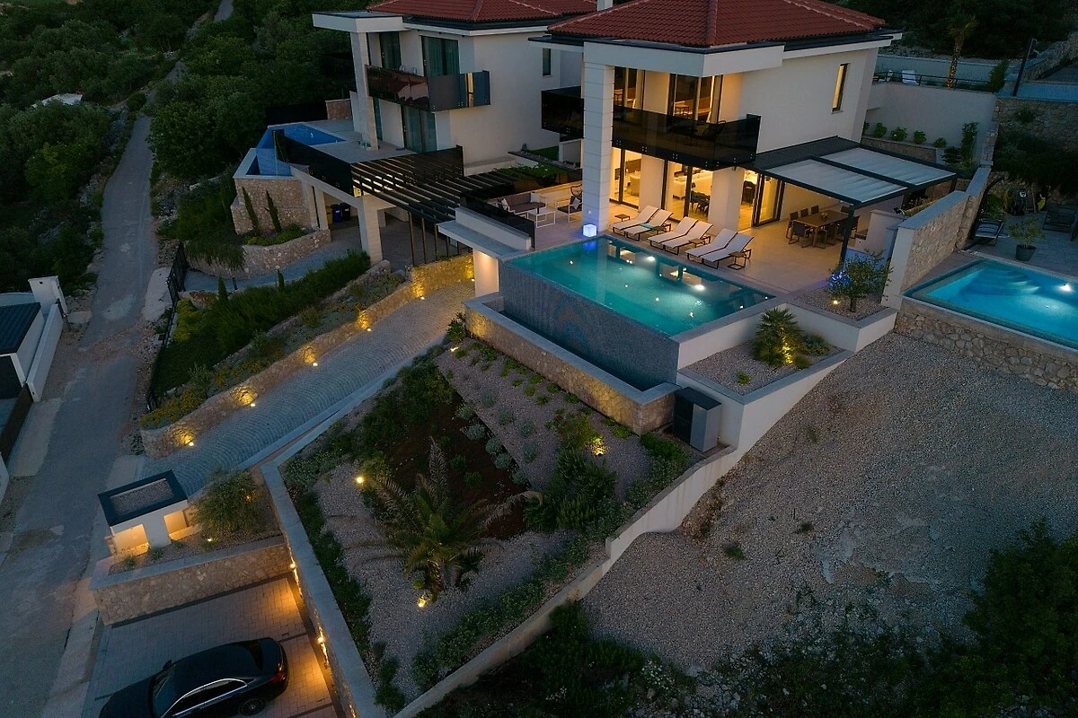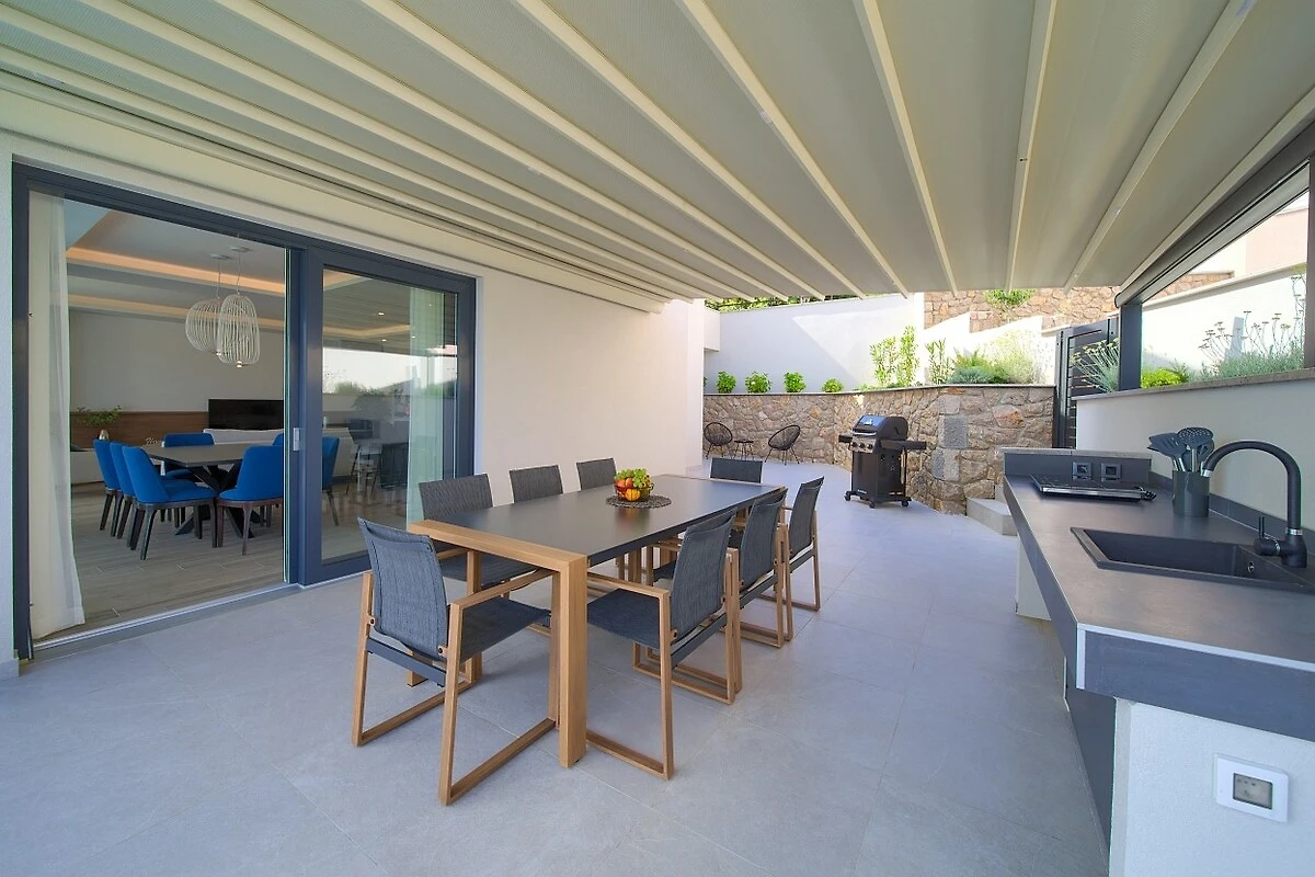 Im Erdgeschoss befindet sich ein geräumiges Wohnzimmer mit Esszimmer, sowie eine voll ausgestattete Küche. Vom Wohnzimmer gelangt man auf die Terrasse, von der aus Sie Zugang zum 32 m² großen Infinity-Pool mit Gartenmöbeln und einer Dusche haben.