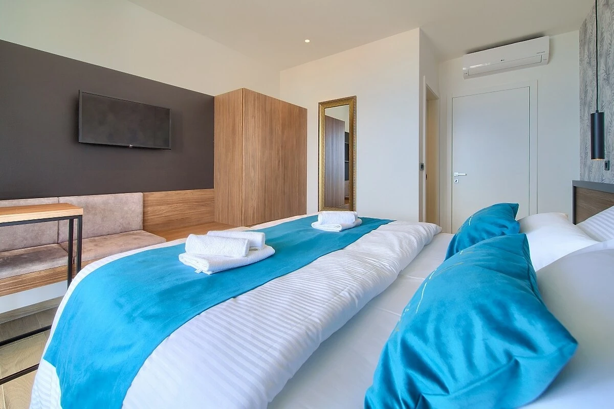 Im ersten Stock befinden sich drei Zimmer. Zwei Zimmer teilen sich einen überdachten Balkon mit Meerblick, jeweils mit eigenen Gartenstühlen und einem Tisch. Das dritte Zimmer im ersten Stock verfügt über eine eigene Terrasse. Alle Zimmer sind klimatisiert und verfügen über einen TV und ein Badezimmer mit Dusche.