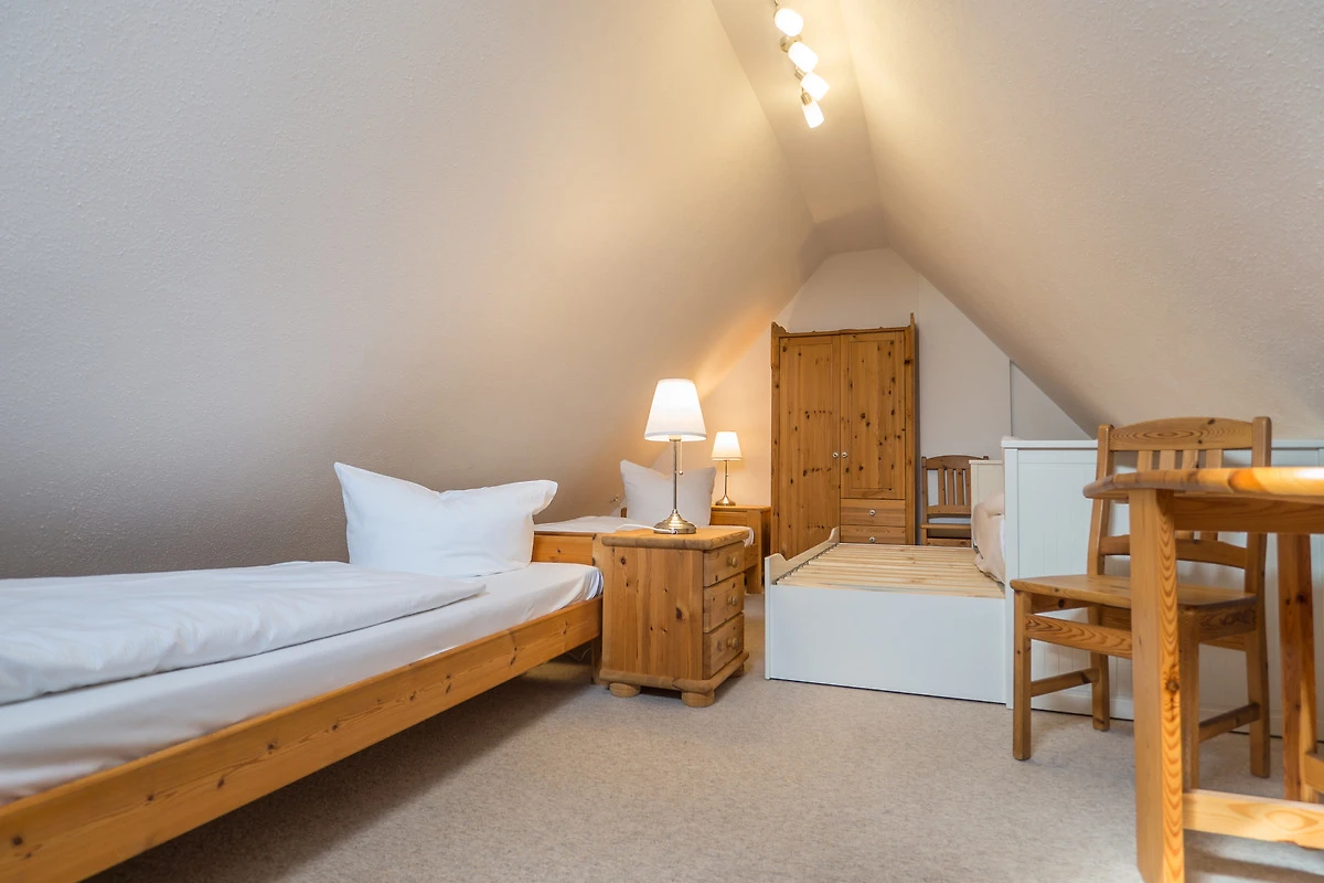 Vom Küchen/Essbereich führt Sie eine Holztreppe nach oben in den Spitzboden. Es befinden sich hier bis zu vier weitere Schlafplätze, ein kleiner Tisch und ein Kleiderschrank.