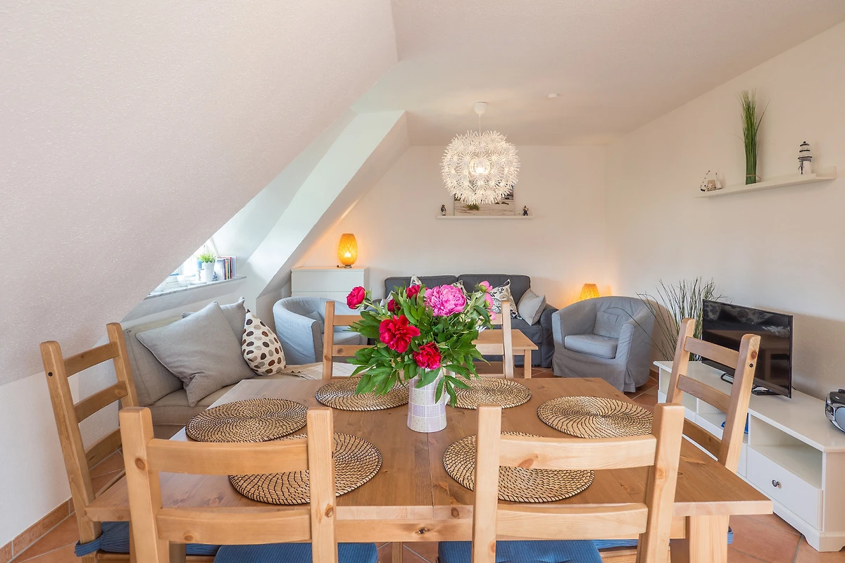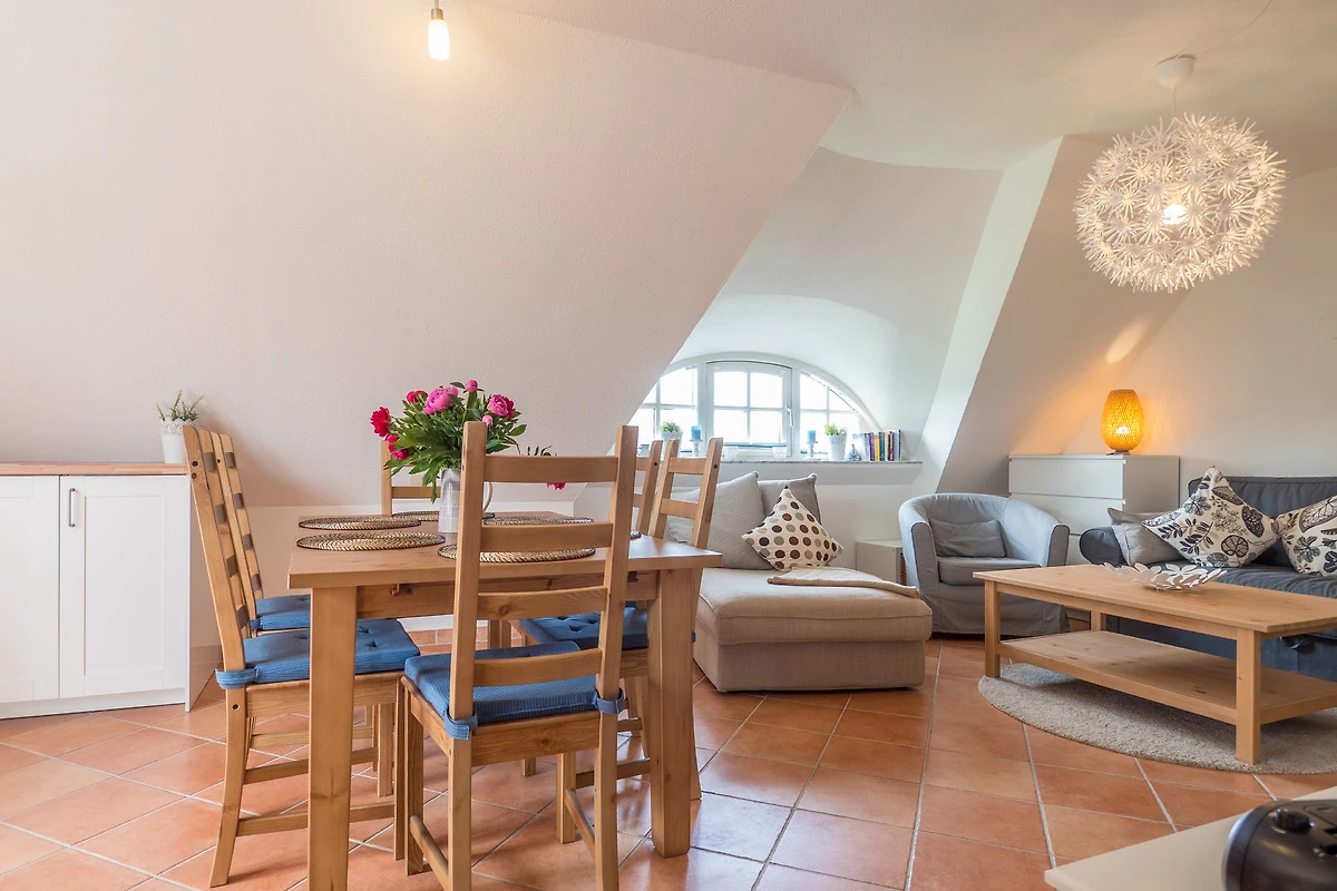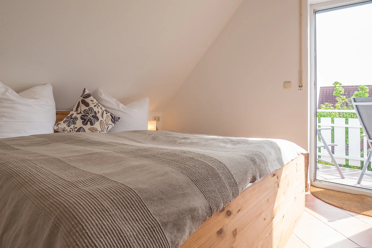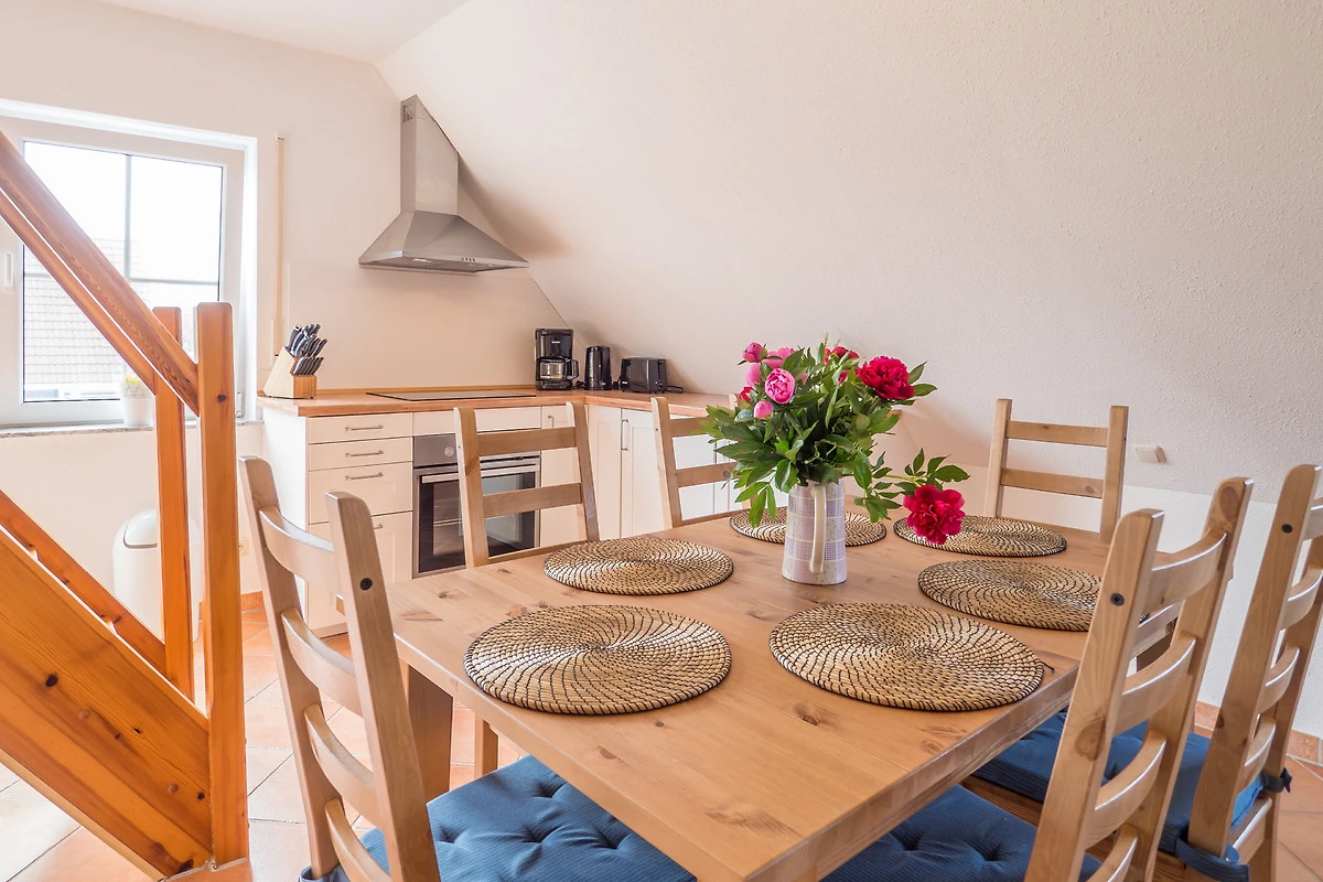 Ihre Maisonette-Ferienwohnung "Die Sehnsucht" (für bis zu 6 Personen) befindet sich im 1.OG / DG ( Spitzboden ) der linken Doppelhaushälfte und ist über ein Treppenhaus zu erreichen. Sie betreten die Wohnung über den schönen, hell eingerichteten Flur. Von hier haben Sie Zugang zu allen weiteren Räumlichkeiten, dem Bad, dem separaten Schlafzimmer, wie auch dem besonders lichtdurchfluteten Wohn-/Essbereich mit offener Küche.