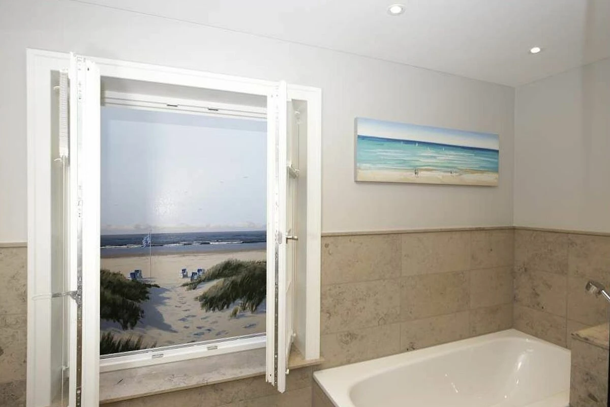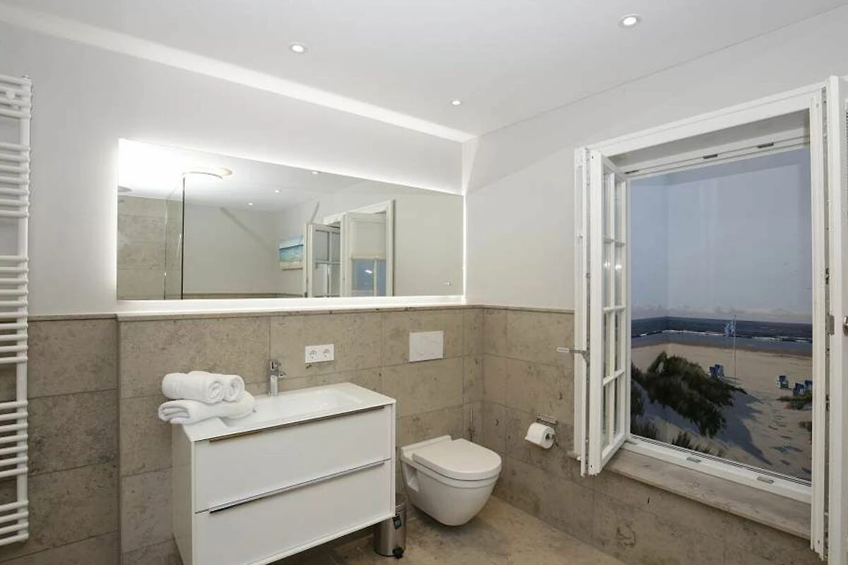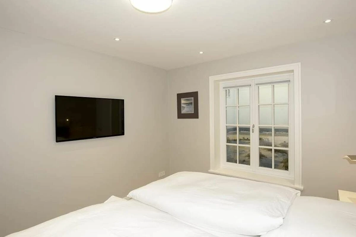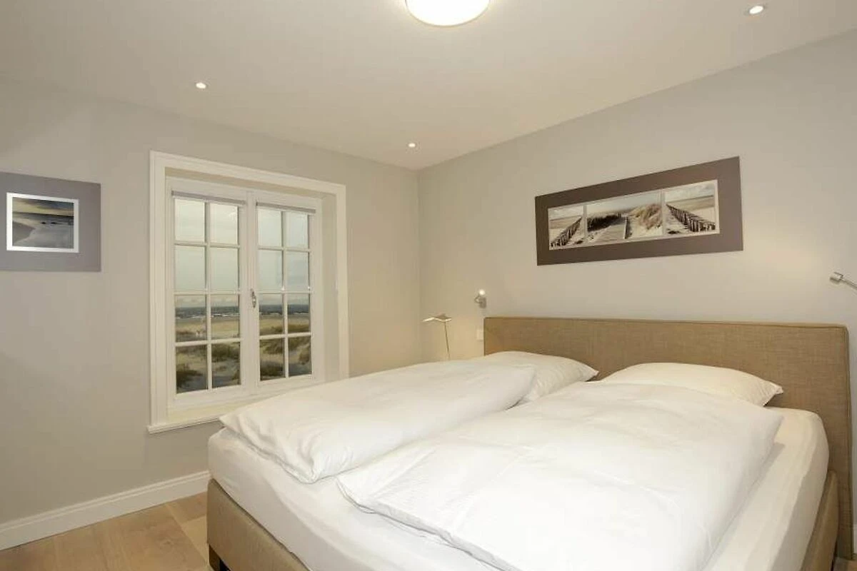 Im Obergeschoss gelangt man über den Flur mit Sekretär (mit Blick über Westerland bis hin zu den Dünen) in zwei weitere hochwertige Schlafzimmer mit Doppelbetten (1,80 x 2,00 m, Einzelmatratzen) und ein weiteres Badezimmer mit Dusche, Waschtisch, Handtuchtrockner, Fön und WC mit Geruchabsaugung.