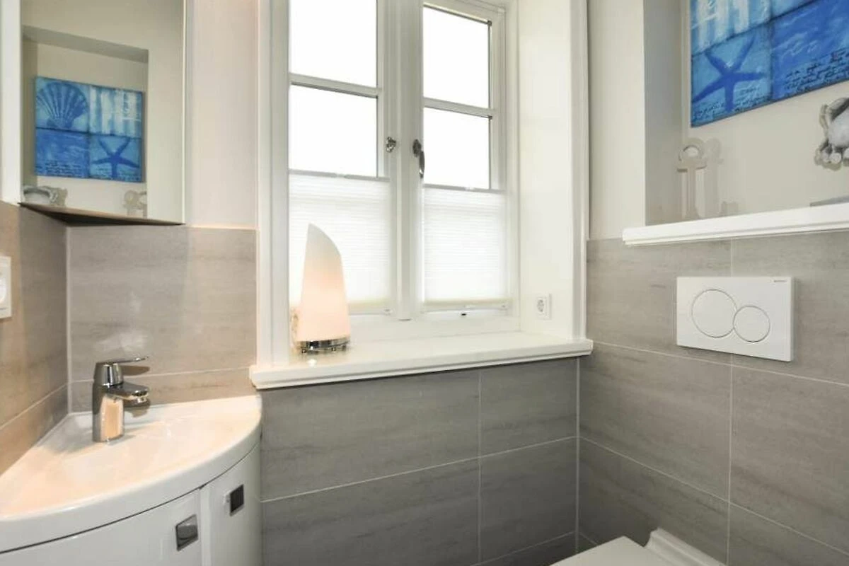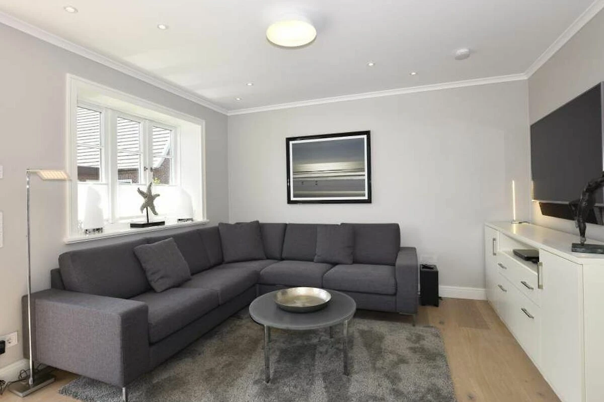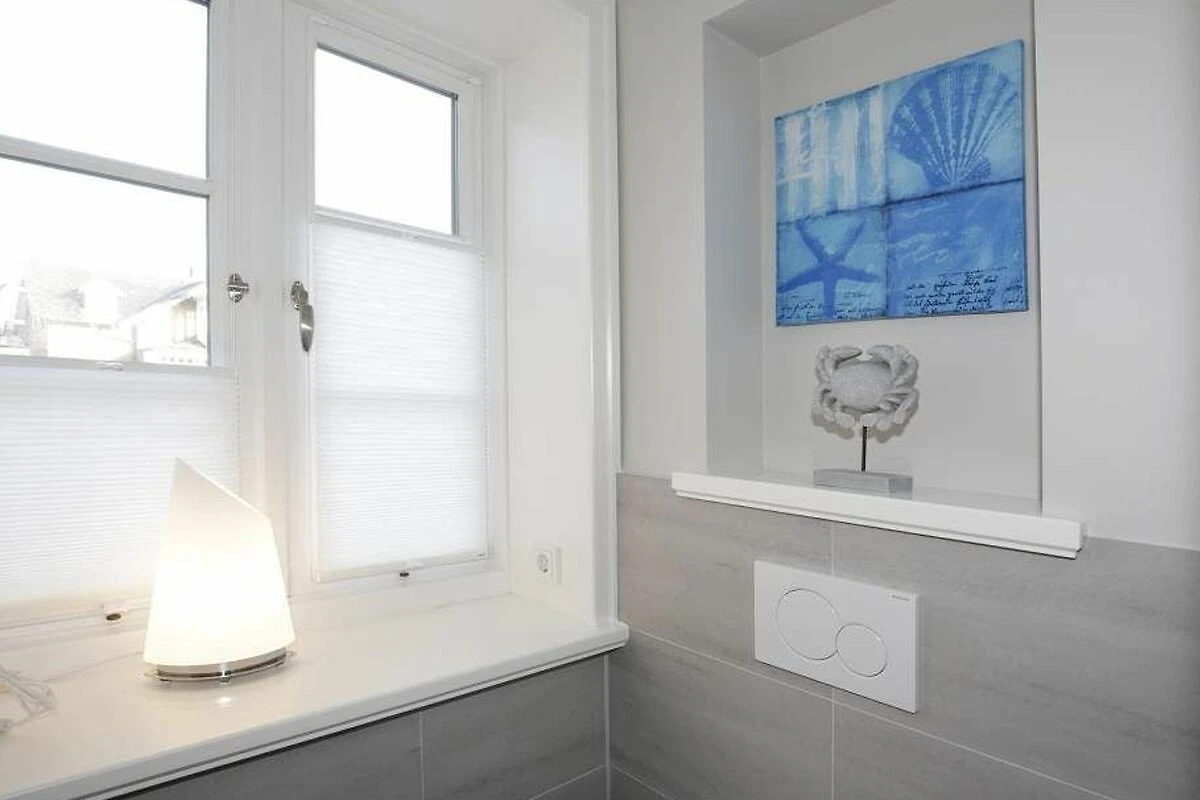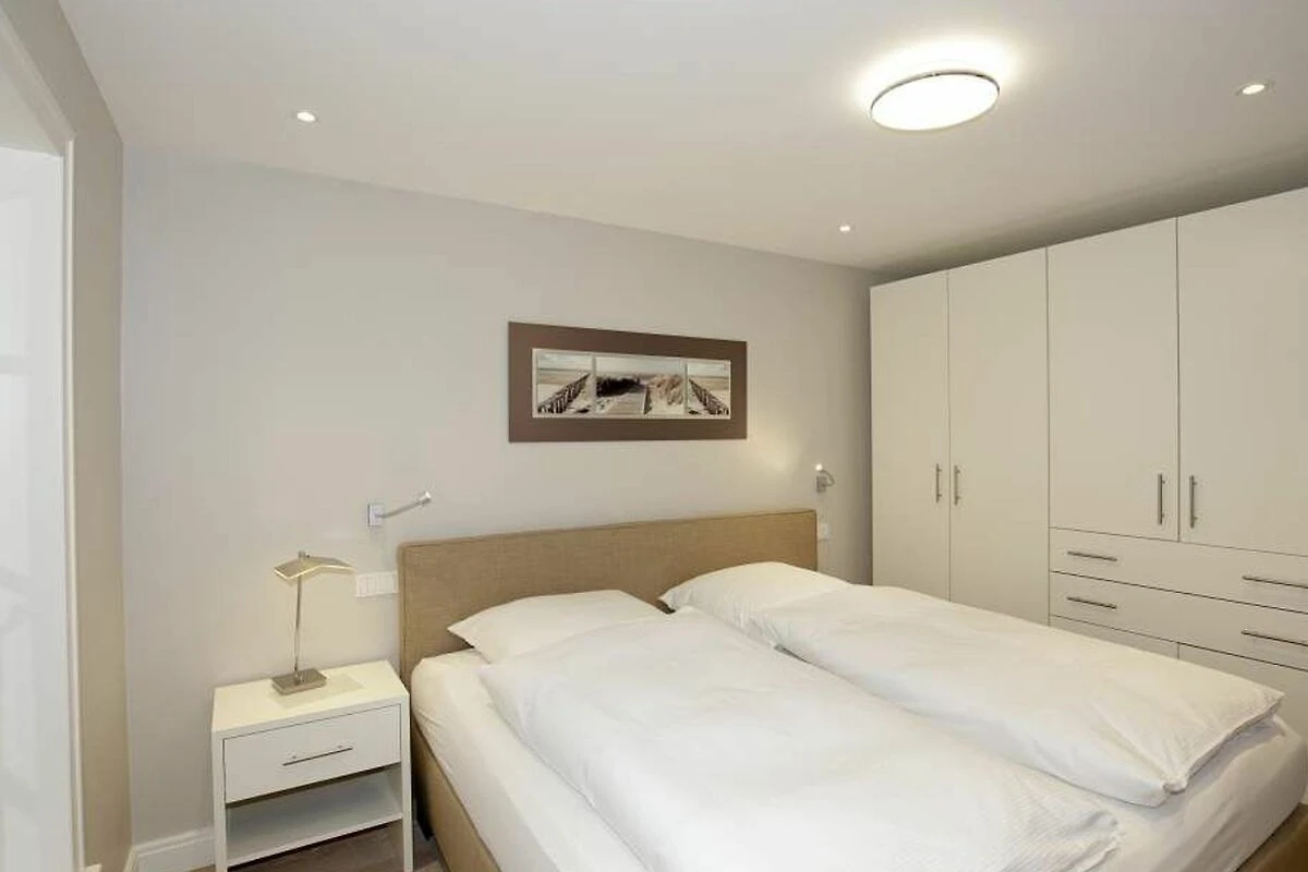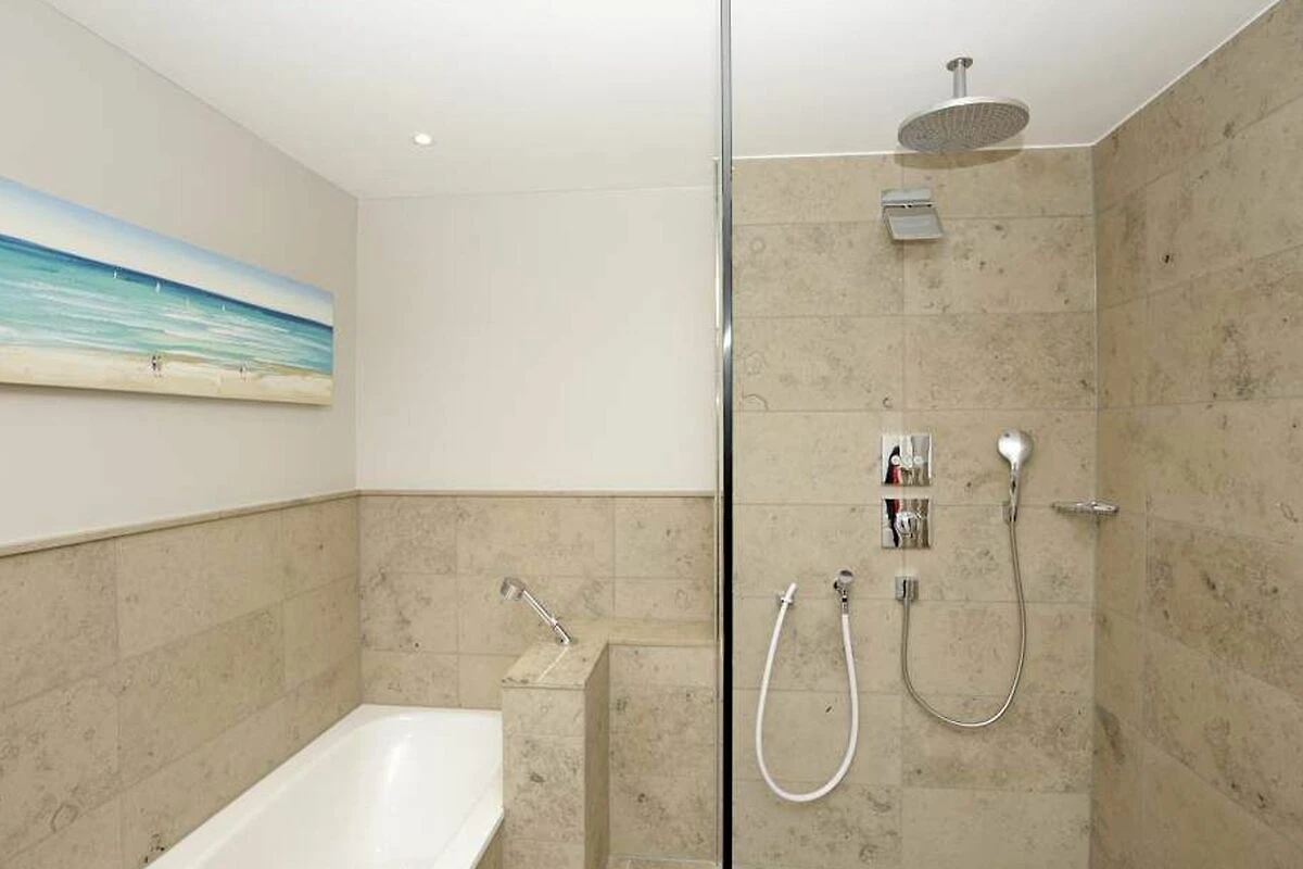 Im Obergeschoss gelangt man über den Flur mit Sekretär (mit Blick über Westerland bis hin zu den Dünen) in zwei weitere hochwertige Schlafzimmer mit Doppelbetten (1,80 x 2,00 m, Einzelmatratzen) und ein weiteres Badezimmer mit Dusche, Waschtisch, Handtuchtrockner, Fön und WC mit Geruchabsaugung.
