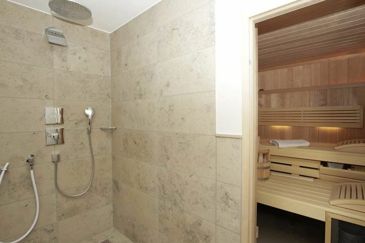 Im Untergeschoss befinden sich ein komfortables Schlafzimmer mit Doppelbett in Übergrösse (2,00 x 2,00 m, Einzelmatratzen) und ein grosszügiges Badezimmer mit Dusche, Badewanne, Sauna, Waschtisch, Handtuchtrockner, Fön und WC mit Geruchabsaugung