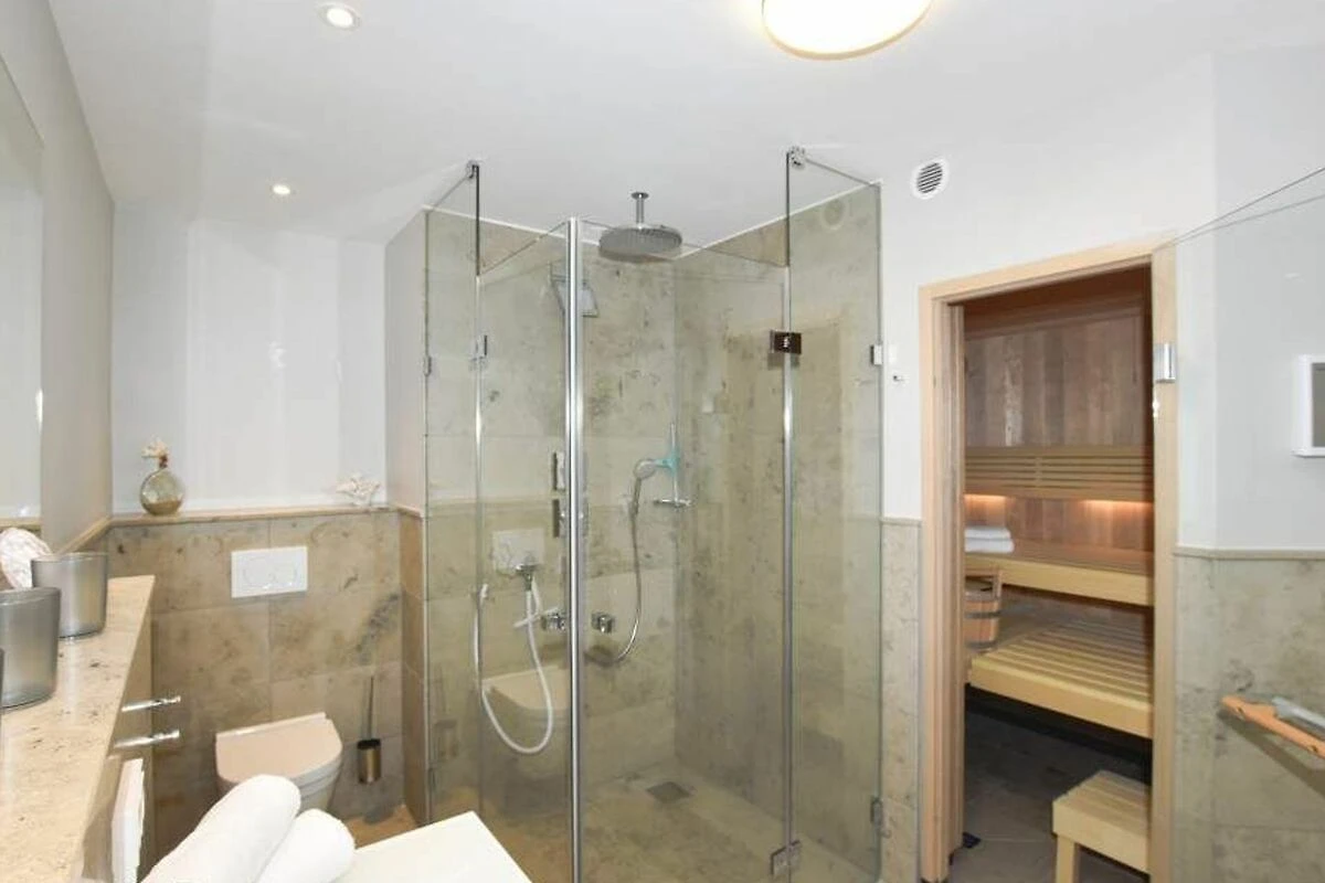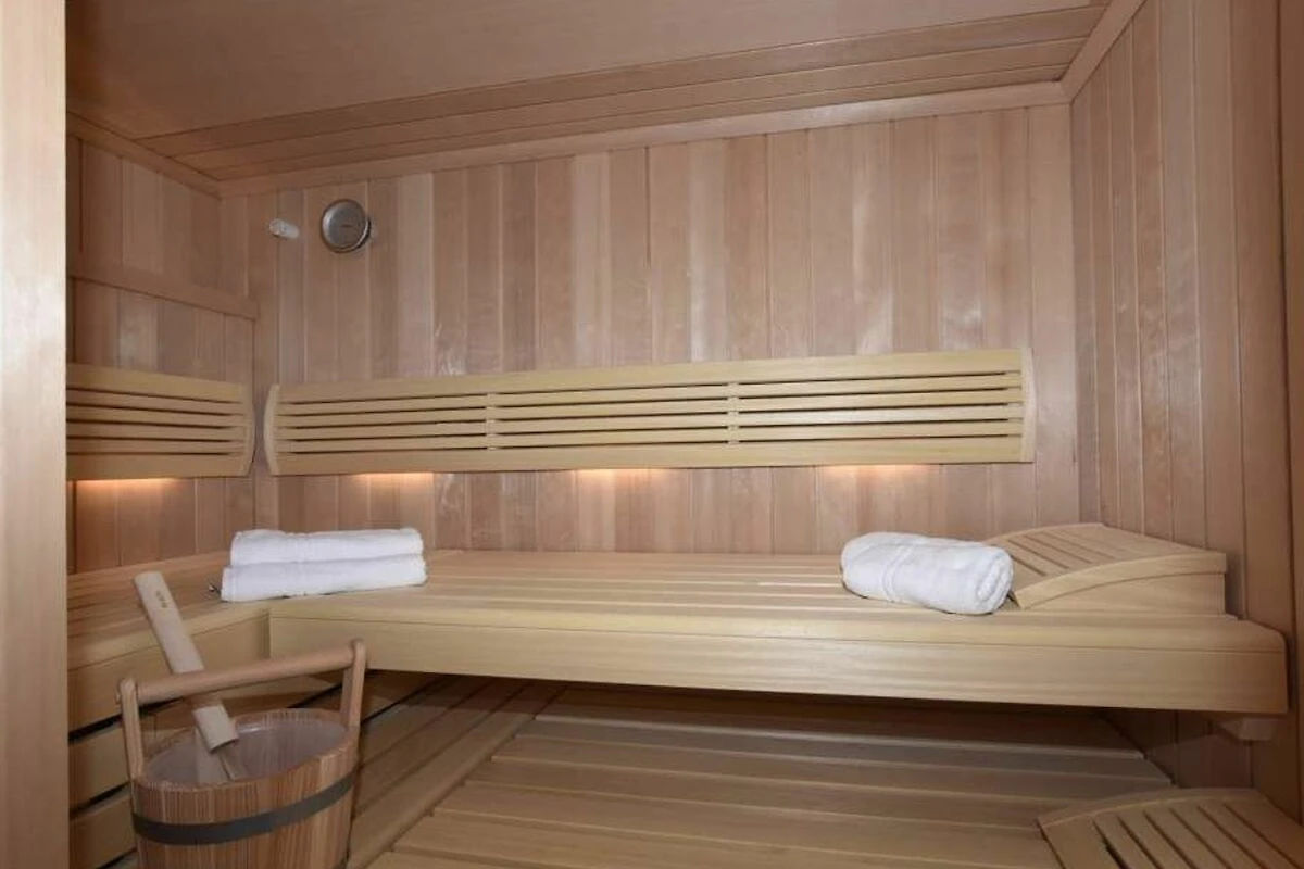Im Untergeschoss befinden sich ein komfortables Schlafzimmer mit Doppelbett in Übergrösse (2,00 x 2,00 m, Einzelmatratzen) und ein grosszügiges Badezimmer mit Dusche, Badewanne, Sauna, Waschtisch, Handtuchtrockner, Fön und WC.