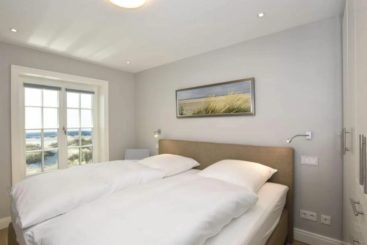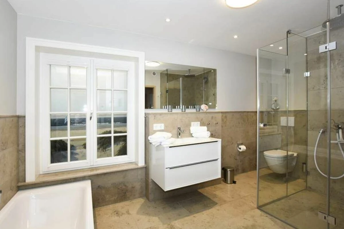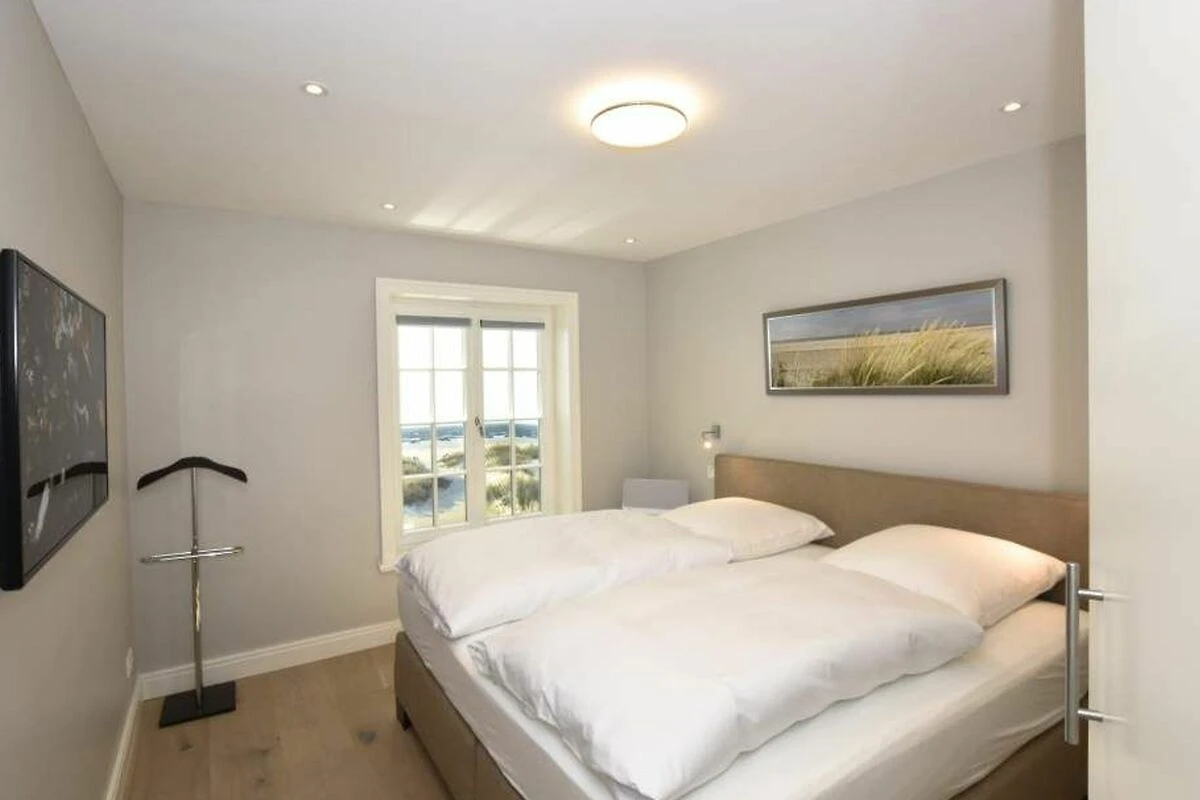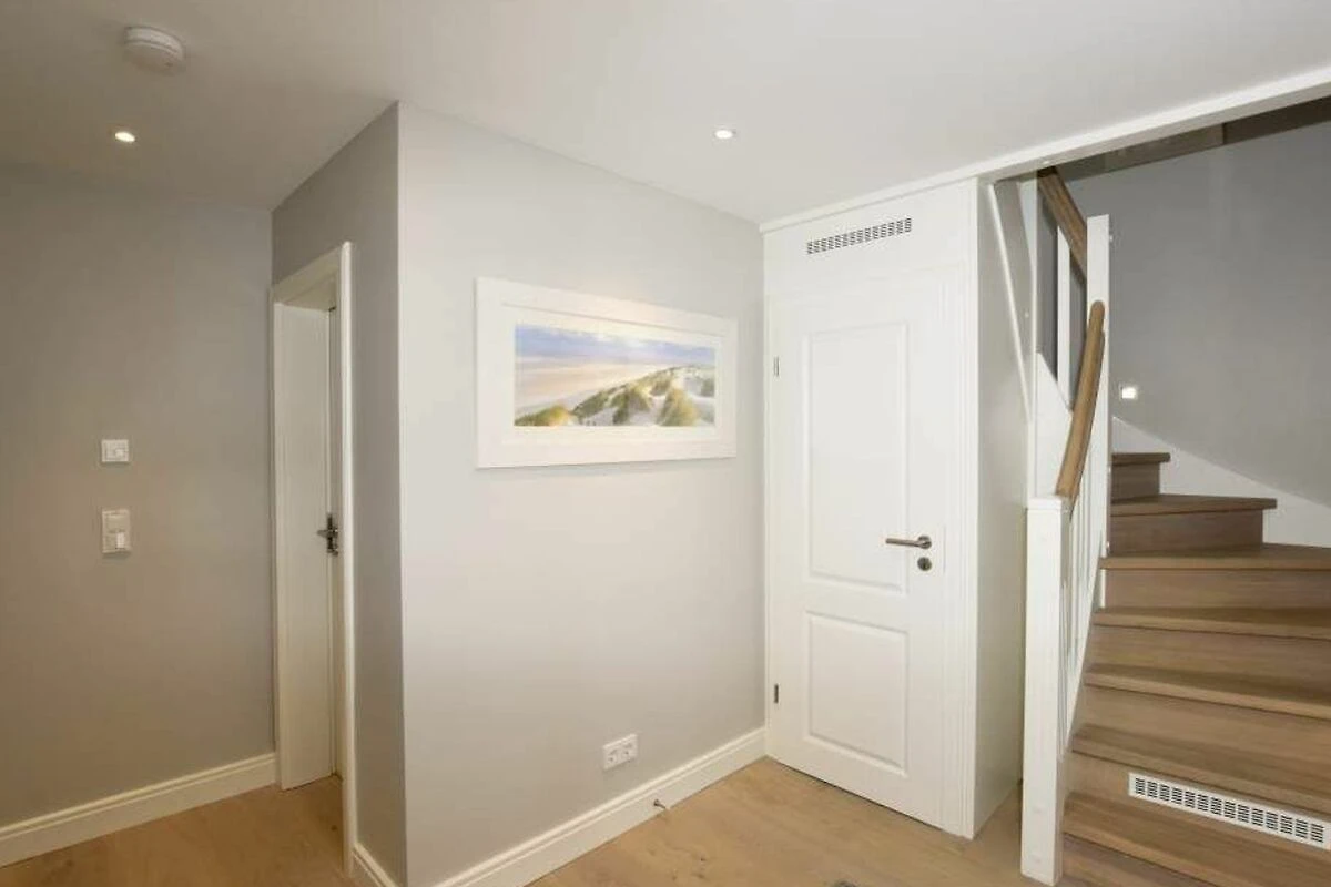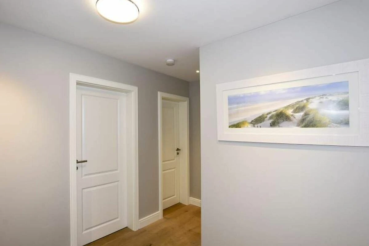 Im Obergeschoss gelangt man über den Flur mit Sekretär (mit Blick über Westerland bis hin zu den Dünen) in zwei weitere hochwertige Schlafzimmer mit Doppelbetten (1,80 x 2,00 m, Einzelmatratzen) und ein weiteres Badezimmer mit Dusche, Waschtisch, Handtuchtrockner, Fön und WC.