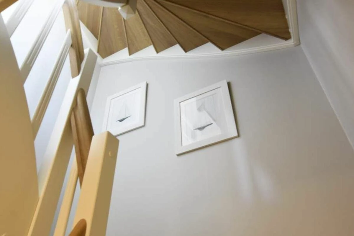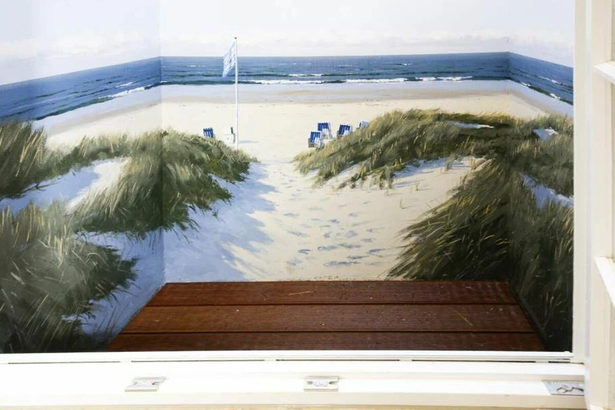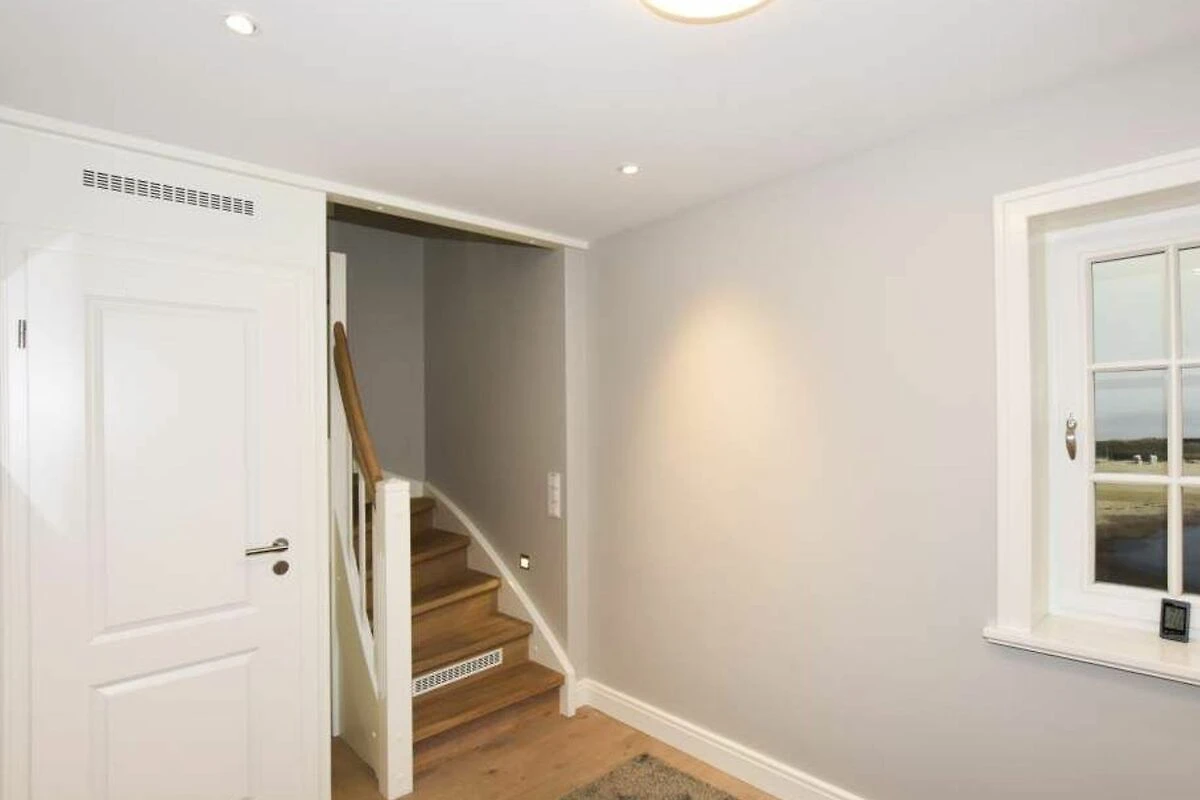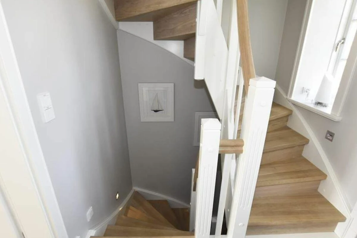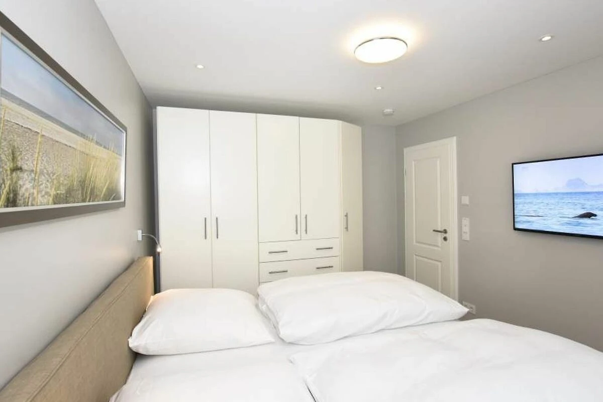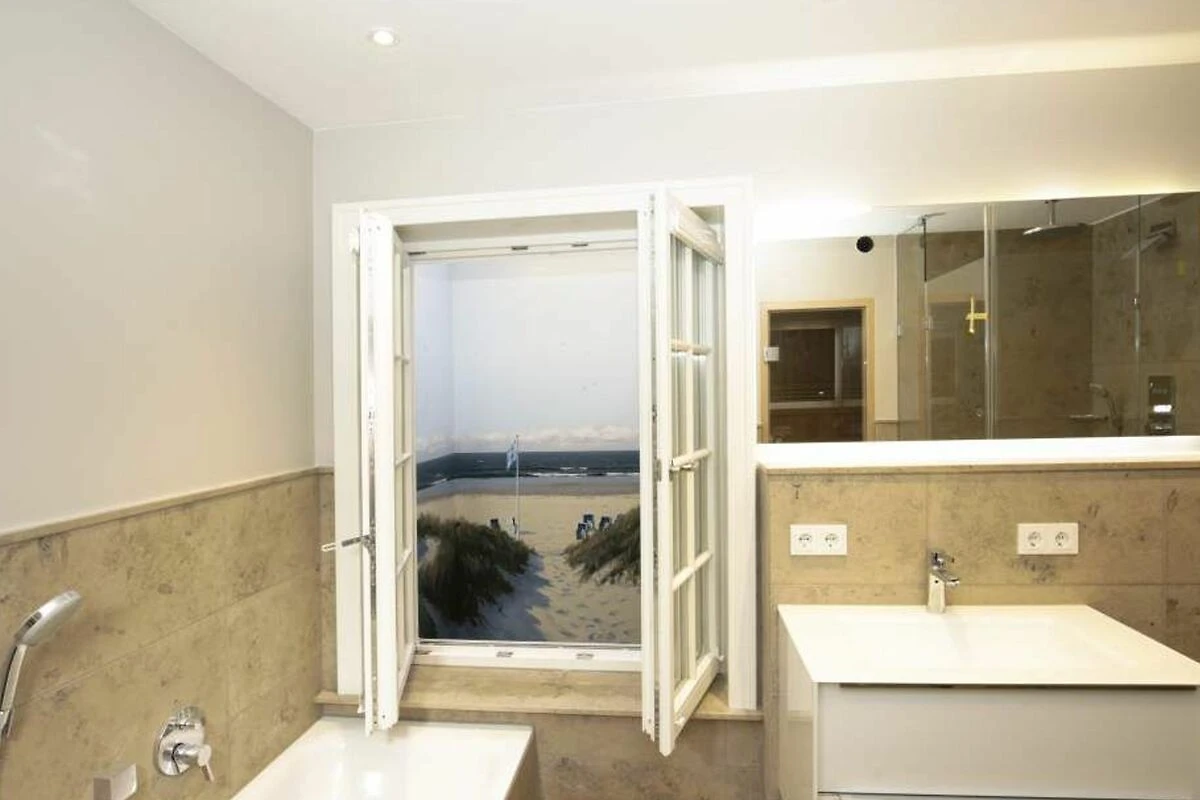Im Obergeschoss gelangt man über den Flur mit Sekretär (mit Blick über Westerland bis hin zu den Dünen) in zwei weitere hochwertige Schlafzimmer mit Doppelbetten (1,80 x 2,00 m, Einzelmatratzen) und ein weiteres Badezimmer mit Dusche, Waschtisch, Handtuchtrockner, Fön und WC.