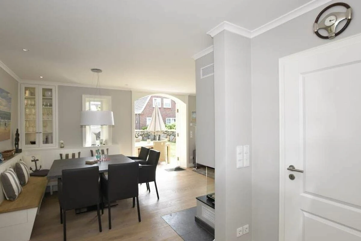 Im Erdgeschoss gelangt man über die Diele in das lichtdurchflutete Wohnzimmer mit Austritt zu Terrasse (mit Strandkorb und Terrassenmöbeln) und Garten.