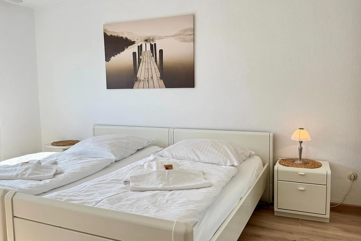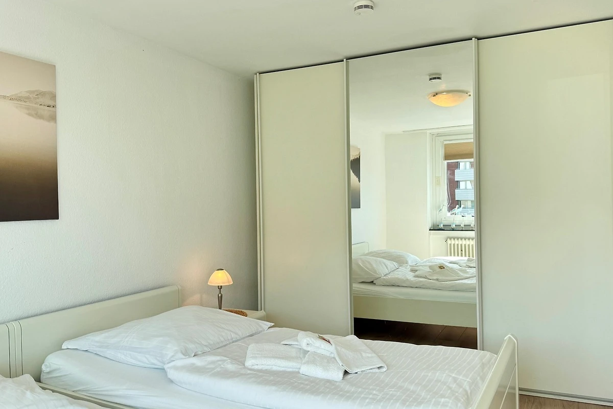 Das Schlafzimmer ist mit einem Doppelbett (bzw. auf Wunsch zwei Einzelbetten), Nachttischen und einem dreitürigen Schrank mit Schiebetüren und integriertem Spiegel ausgestattet.
