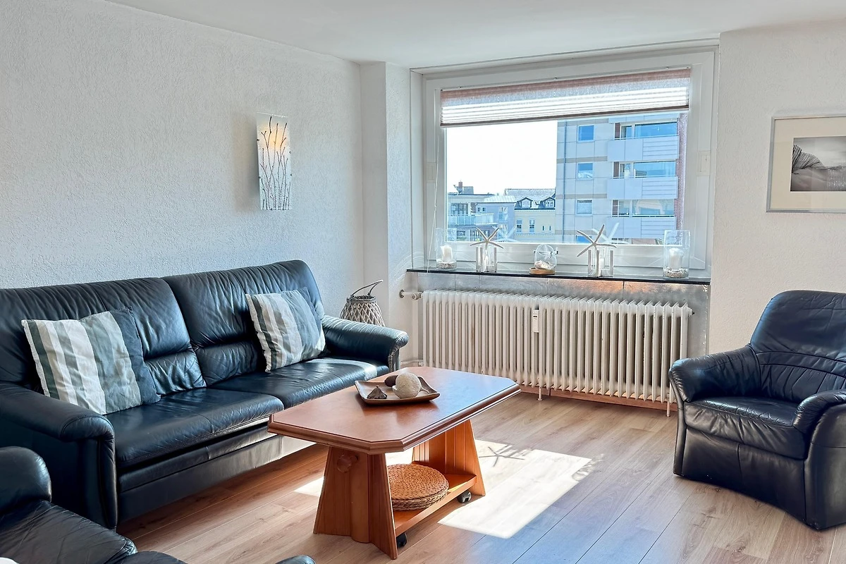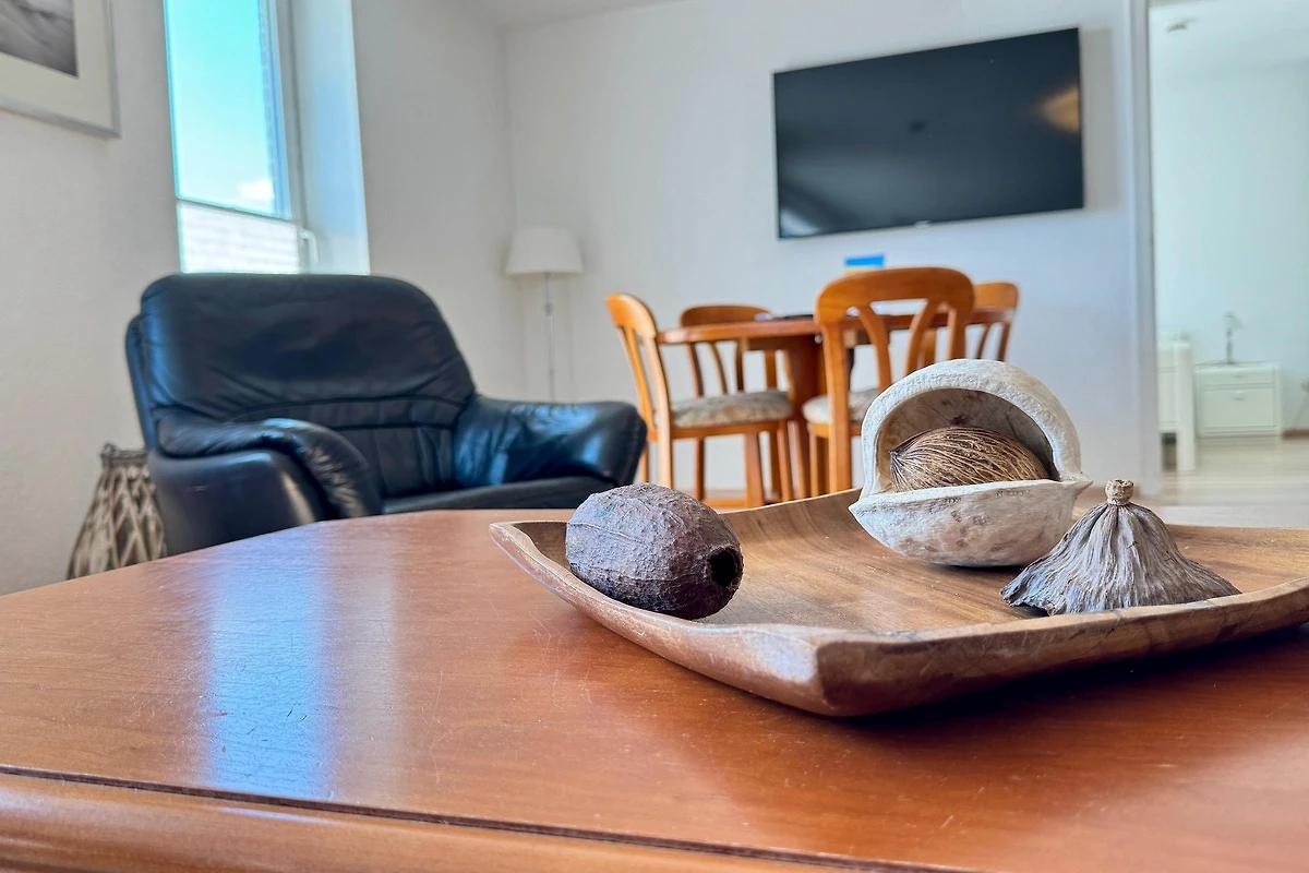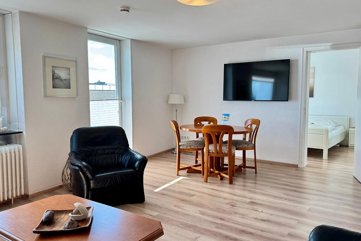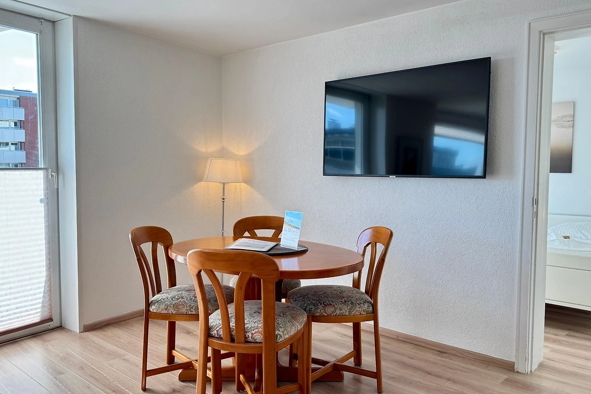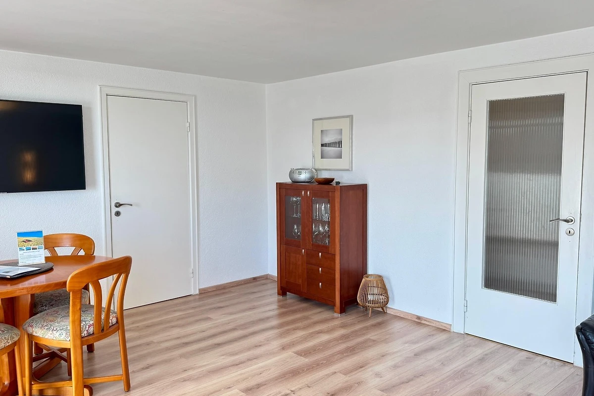 Im Wohnzimmer befinden sich neben einer schwarzen Ledergarnitur Massivholzmöbel. Ein separarter Esstisch steht Ihnen mit vier Sitzplätzen zur Verfügung. Die beiden Zimmer sind einheitlich mit Laminat ausgelegt. Ein 55 Zoll-Flachbildschirm rundet das bequeme und moderne Wohnzimmer ab. Der Balkon zum Osten hin bietet einen tollen Blick zum Sonnenaufgang.