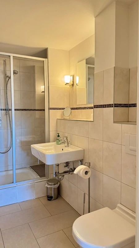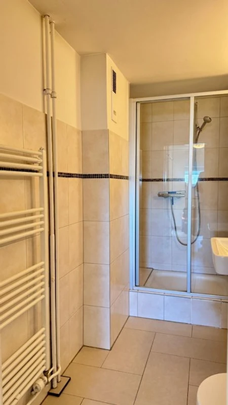 In dem Bad befindet sich eine grosszügige Dusche, Waschtisch, WC und ein beheizter Handtuchhalter.