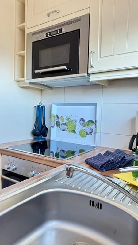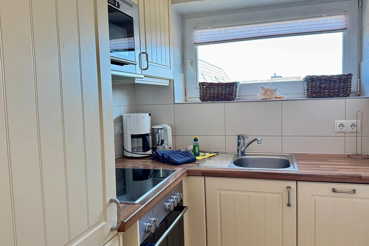 Die Küche bietet eine kleine, voll ausgestattete Einbauküche mit Kühlschrank und integriertem Gefrierfach, Backofen, Cerankochfeld mit 4 Platten, Spüle, Geschirrspüler und integrierter Mikrowelle. Die Küche verfügt über ein separates Fenster.