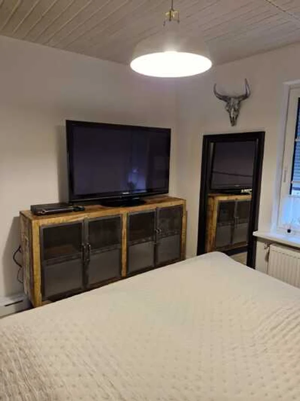 Schlafzimmer mit 1,80x2,00 Meter Polsterbett und ebenfalls einem großem Flachbild Fernseher.