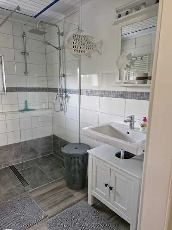 Tageslicht Bad mit ebenerdiger Dusche, Küche mit Backofen und Ceranfeld, Kühlschrank mit Eisfach, Wasserkocher, Toaster, Eierkocher, Kaffeemaschine uvm
