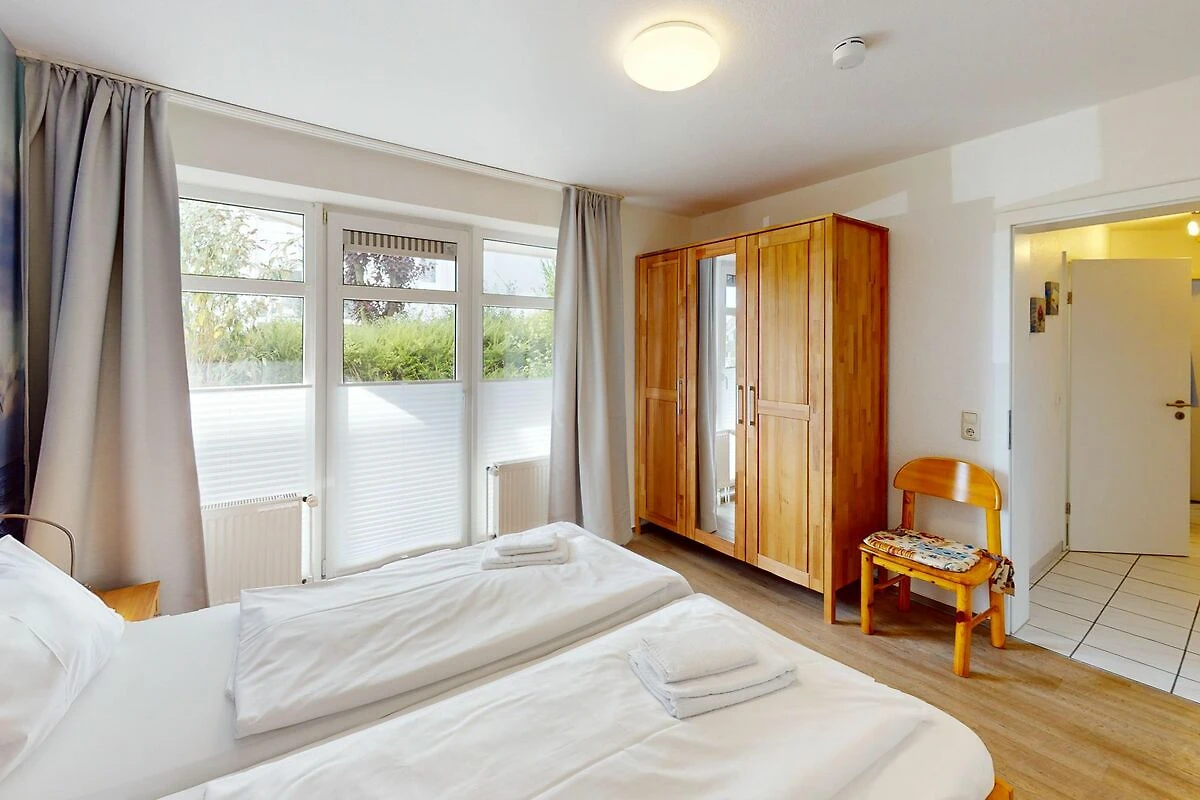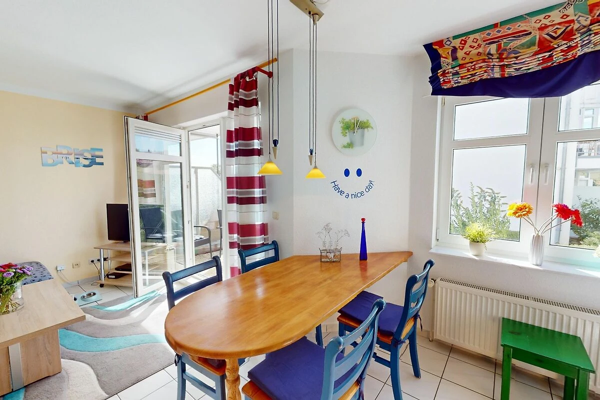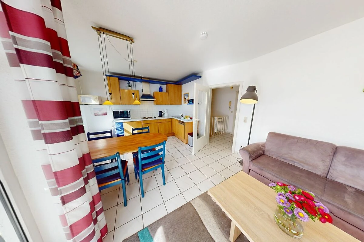 Die helle Wohnung bietet einen Wohn- /Essbereich mit offener Küchenzeile, einen möblierten Balkon, ein Gäste- WC und ein modernes Badezimmer mit Dusche. Eins der Schlafzimmer verfügt über ein Doppelbett, das andere über zwei Einzelbetten - in beiden Schlafzimmern wurde ein neuer Design-Plankenboden verlegt, der für ein modernes, gesundes Raumklima sorgt.