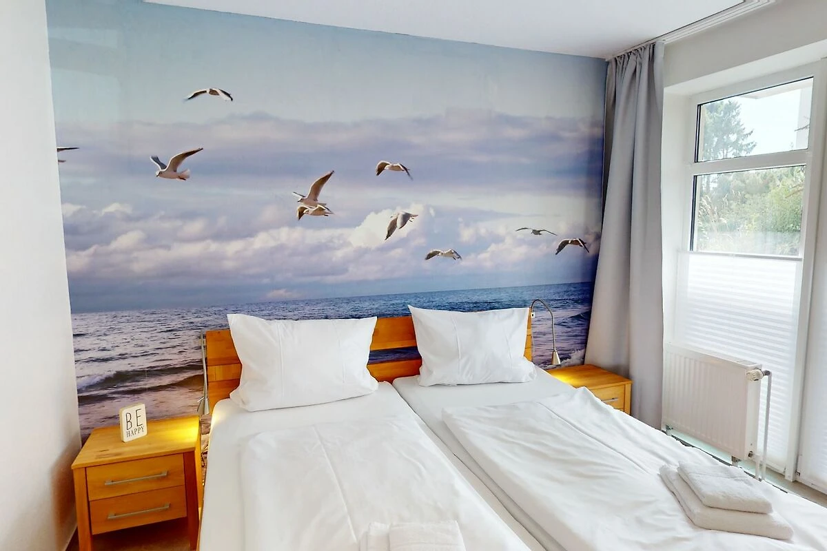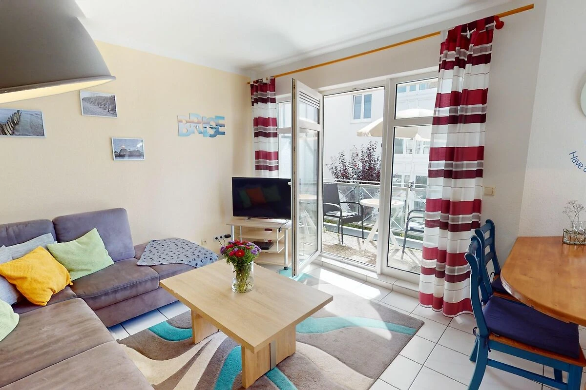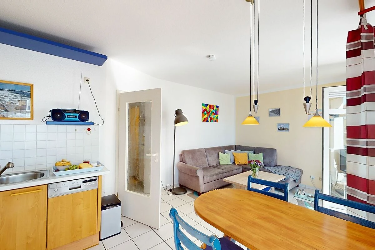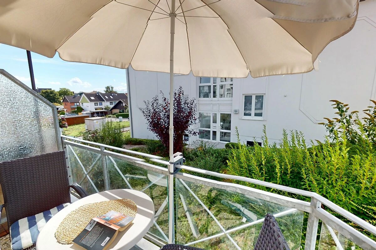 Die helle Wohnung bietet einen Wohn- /Essbereich mit offener Küchenzeile, einen möblierten Balkon, ein Gäste- WC und ein modernes Badezimmer mit Dusche. Eins der Schlafzimmer verfügt über ein Doppelbett, das andere über zwei Einzelbetten - in beiden Schlafzimmern wurde ein neuer Design-Plankenboden verlegt, der für ein modernes, gesundes Raumklima sorgt.