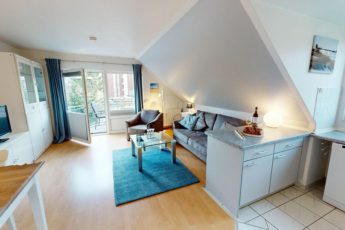 Über den Wohnbereich gelangen Sie auf den möblierten Süd-Ost-Balkon – genießen Sie Ihr Frühstück oder die Abendstunden an der frischen Ostseeluft!