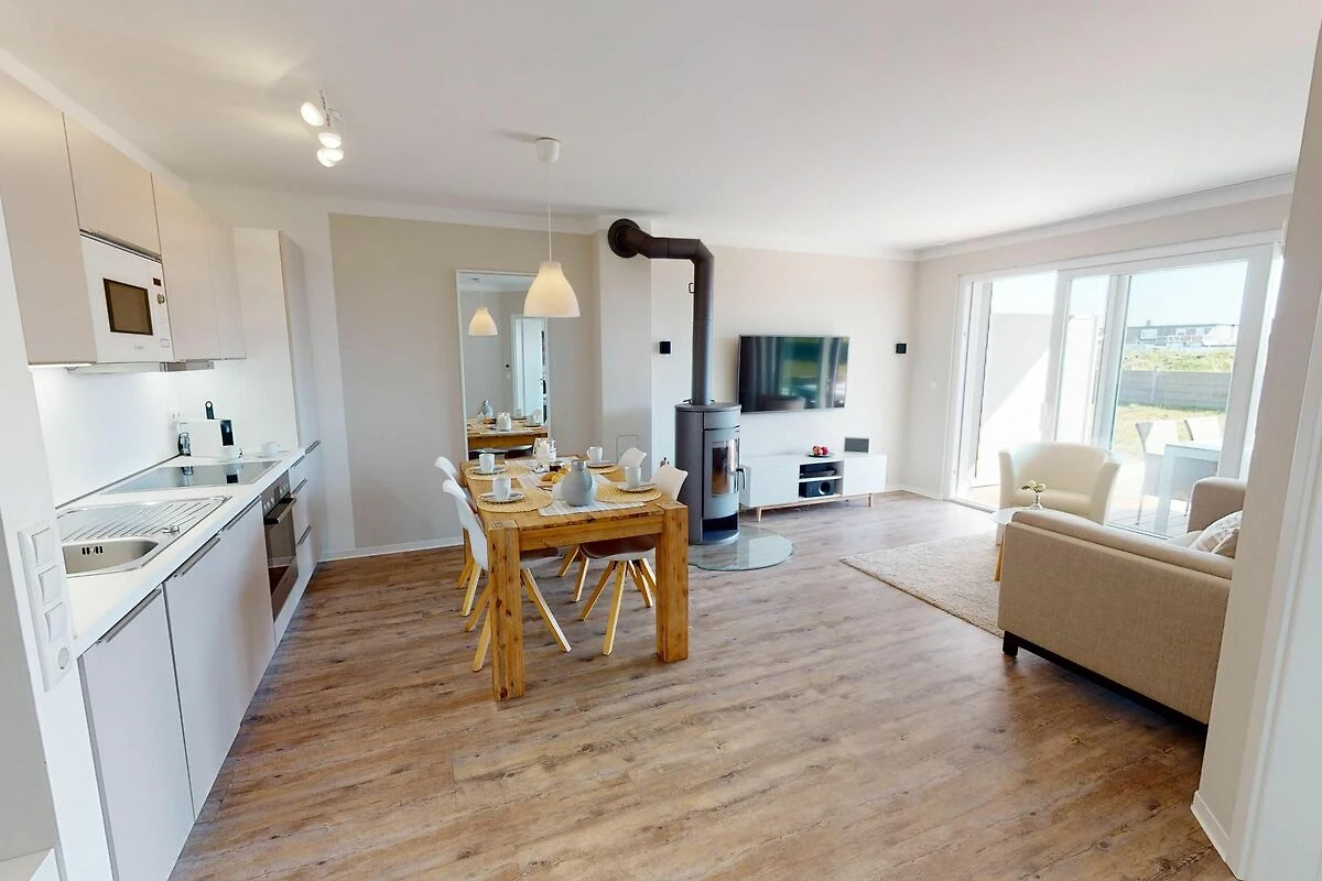 Im Wohnzimmer lädt ein gemütlicher Sofabereich mit Kaminofen und ein großer Flachbildfernseher zum Entspannen ein. Das kuschelige Schlafzimmer verfügt über ein hochwertiges Boxspringbett und ein Flachbild-Fernseher, während das Badezimmer mit einer großen, bodengleichen Dusche mit Regenbrause, einer Whirlwanne, einem beleuchteten Wand- und Kosmetikspiegel und einem Fön ausgestattet ist. Die große Terrasse mit Terrassenmöbeln und modernem Gas-Grill (Gasflaschen werden bereitgestellt) ist sowohl vom Wohnzimmer als auch vom Schlafzimmer aus erreichbar.