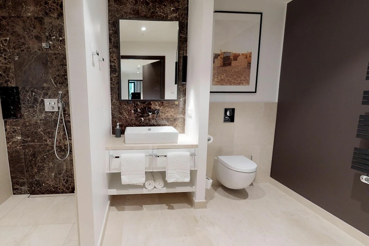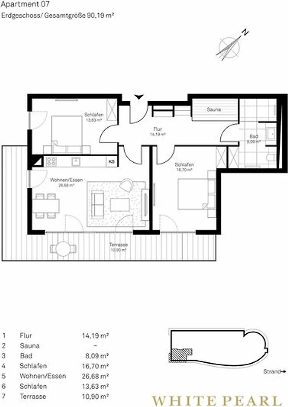 Wenige Minuten vom Strand entfernt befindet sich die Luxussuite 0.07 im Erdgeschoss des "White Pearl" und bietet auf 90 m² Platz für 5 Personen – auch Ihr Hund ist willkommen. Die Suite verfügt über zwei separate Schlafzimmer sowie ein Schlafsofa im Wohnbereich für eine Person.