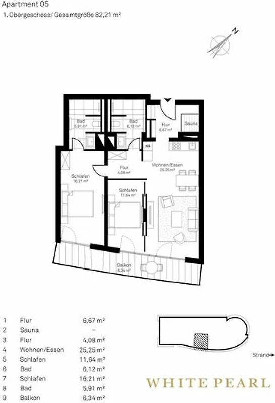 Die großzügige Luxussuite 1.05 befindet sich im 1. Obergeschoss des "White Pearl" und bietet Platz für 4 Personen auf 82 m² mit zwei Schlafzimmern.