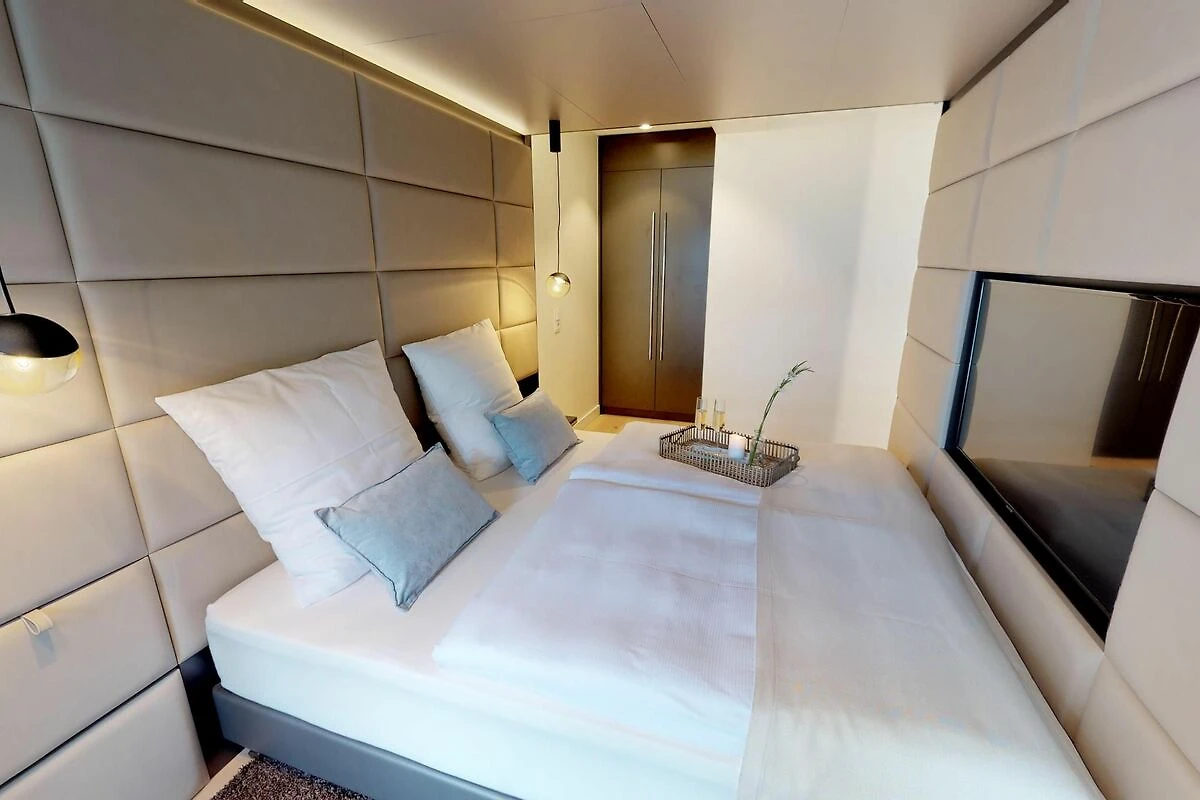 Sie erwartet eine gut ausgestattete Küchenzeile mit einer Essecke im Wohnbereich. Der helle, offene Wohn- und Essbereich wird durch eine gemütliche Couch und einen Sessel komplettiert. Das separate Schlafzimmer verfügt über ein Boxspring-Doppelbett, das durch Lamellenschiebetüren abgetrennt werden kann. Darüber hinaus gibt es ein modernes Badezimmer mit Dusche. Abgerundet wird das Apartment durch die eigene Sauna (2,37m x 1,19m).