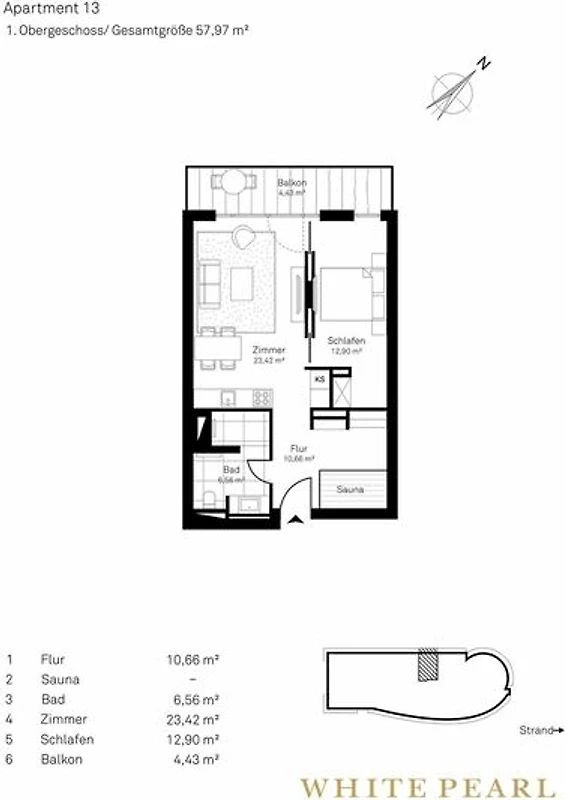 Nur wenige Meter vom Strand entfernt liegt das Luxusapartment 1.13 im 1. Obergeschoss des "White Pearl" und bietet auf 58 m² Platz für 2 Personen.