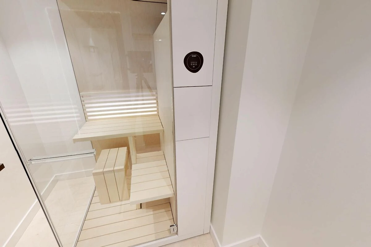 Highlights der Suite sind die eigene kleine Sauna (1,17m x 1,17m) sowie der möblierte Balkon Richtung Ostseite, der entspannte Stunden an der frischen Luft ermöglicht! Zur Wohnung gehört ein Tiefgaragenstellplatz.