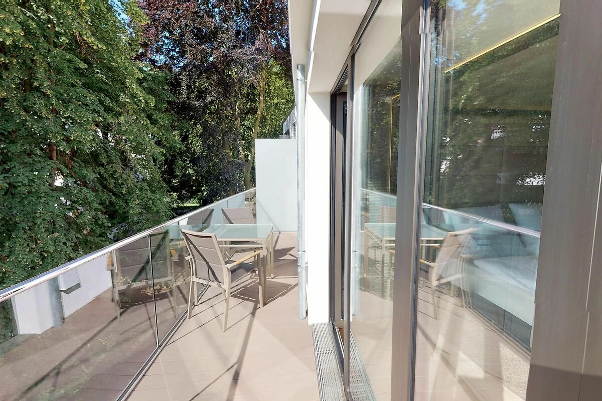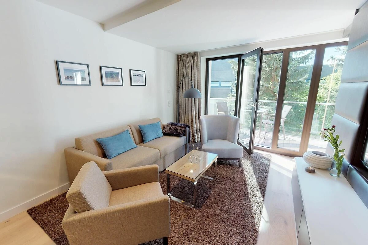 Es erwartet Sie eine voll ausgestattete Küchenzeile mit anschließendem Essbereich sowie der gemütliche Wohnbereich mit Sesseln und einem Sofa. Eines der Schlafzimmer liegt angrenzend ans Wohnzimmer, verfügt über ein Boxspring-Doppelbett und kann durch Lamellen-Schiebetüren abgetrennt werden. Das andere separate Schlafzimmer mit einem Boxspring-Doppelbett hat ein eigenes luxuriöses Bad mit Dusche und Zugang zum Balkon. Des Weiteren gibt es ein separates, modernes Bad mit Dusche.