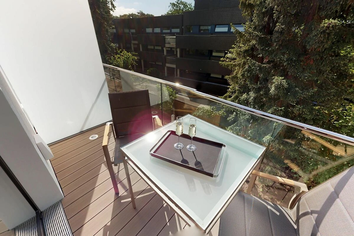 Die Wohnung liegt seitlich schauend in Richtung Timmendorfer Zentrum. Zwar blickt man auf ein gegenüberliegendes Gebäude, doch dieses ist weit genug entfernt, sodass es nicht als störend empfunden wird. Stattdessen nimmt man vor allem den angrenzenden Wald im hinteren Bereich der Anlage wahr – mit seinem angenehmen Duft und der Vielfalt an Vogelstimmen. Der Balkon liegt nachmittags wunderbar in der Sonne und lädt mit ausreichend Sitzgelegenheiten zum entspannten Essen im Freien ein. Auf dem Balkon sind keine Liegen vorhanden aber zwei Tische mit genügenden Sitzgelegenheiten. Der Eingangsbereich ist großzügig gestaltet, bietet Platz für Taschen, Schuhe und sogar eine Ecke, in der sich ein Koffer gut abstellen lässt. Direkt dort befindet sich auch die kleine, aber funktionale Sauna – ideal für zwei Erwachsene und ein Kind. Das Wohnzimmer mit offener Küche und durch eine moderne Trennwand abgetrenntem ersten Schlafbereich bietet ein rundum angenehmes Wohngefühl. Die Küche ist zwar kompakt, aber gut durchdacht und funktional ausgestattet – alle Vorbereitungen lassen sich problemlos erledigen. Besonders gefallen hat uns, dass es neben dem üblichen „Standardsessel“ auch einen zweiten, sehr bequemen Sessel gab – eine schöne Ergänzung für gemütliche Abende. Die Wohnung verfügt über drei Zugänge zur Terrasse, was sie besonders hell und offen macht. Zwei gepflegte Bäder mit hochwertigen Materialien bieten ausreichend Platz und Komfort. Im hinteren Bereich befindet sich ein zweites Schlafzimmer mit eigenem Terrassenzugang. Durch die abschließbare Tür ist dieser Bereich angenehm abgetrennt und bietet viel Ruhe sowie ein großzügiges eigenes Bad. In beiden Schlafbereichen sowie im Flur stehen ausreichend Schränke mit viel Stauraum zur Verfügung. Wir hatten während unseres Aufenthalts das Glück, viele sonnige Tage zu erwischen, und konnten so nach dem Strandbesuch noch lange auf der Terrasse entspannen und die Ruhe genießen.