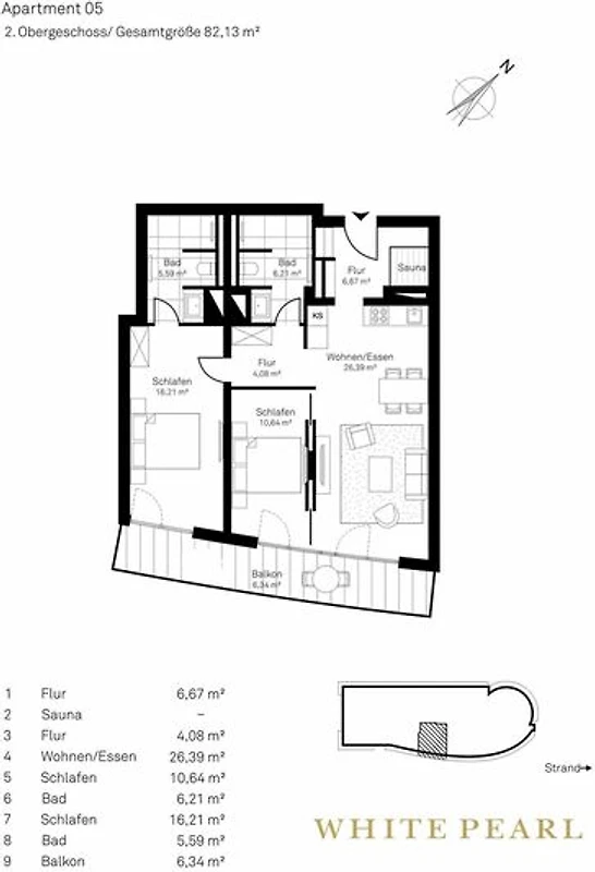 Die großzügige Luxussuite 2.05 befindet sich im 2. Obergeschoss des "White Pearl" und bietet Platz für 4 Personen auf 82 m² mit zwei separaten Schlafzimmern – auch Ihr Hund ist herzlich willkommen!