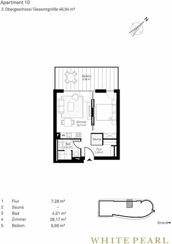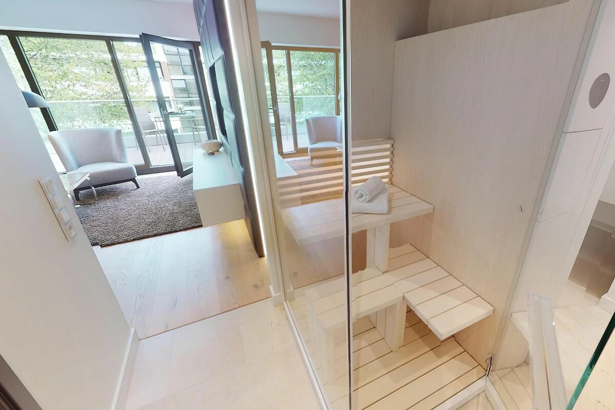 Besondere Highlights des Apartments sind die eigene kleine Sauna (1,17m × 1,17m) sowie der möblierte Balkon, der zu entspannten Stunden an der frischen Luft einlädt! Zur Wohnung gehört außerdem ein Tiefgaragenstellplatz.