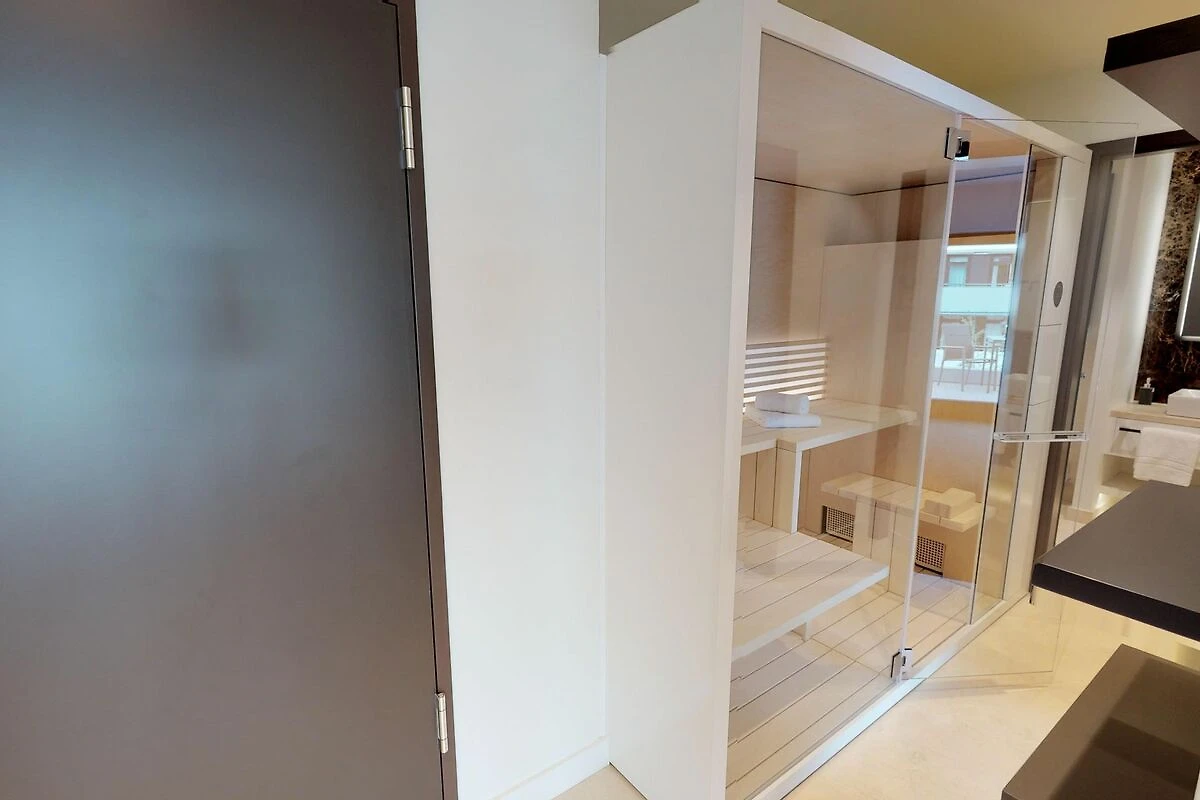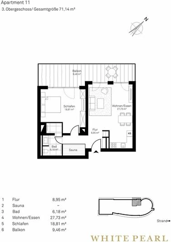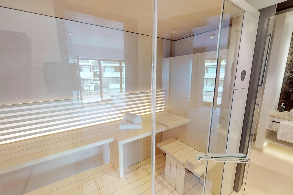 Zu den Highlights des Apartments gehören die eigene Sauna (2,37m x 1,19m) sowie der möblierte Balkon mit Sonnenliegen, der zu entspannten Stunden an der frischen Meeresluft einlädt! Zur Wohnung gehört ein Tiefgaragenstellplatz.