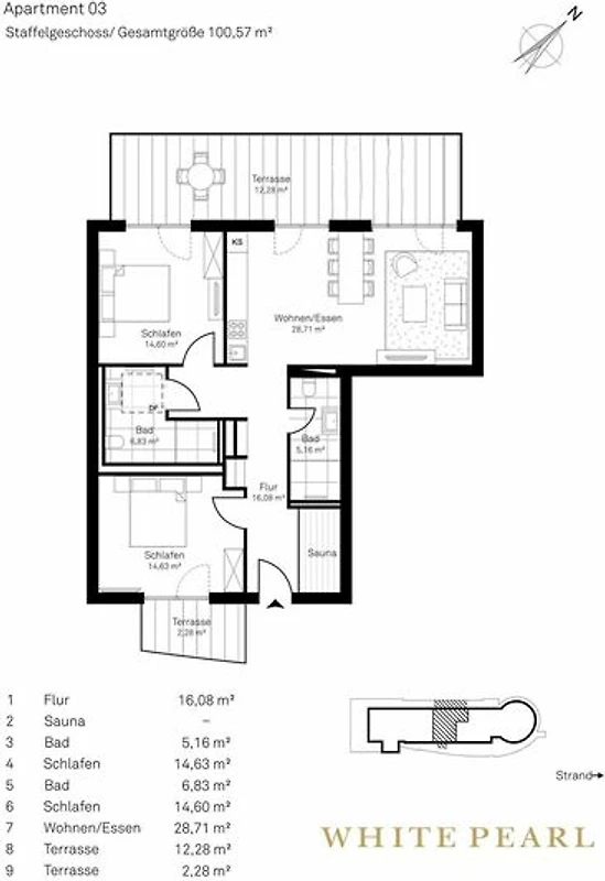 Das Luxus-Penthouse 4.03 befindet sich nur wenige Gehminuten von der Ostsee entfernt im vierten Obergeschoss des "White Pearl" und bietet auf 101 m² Platz für 4 Personen.