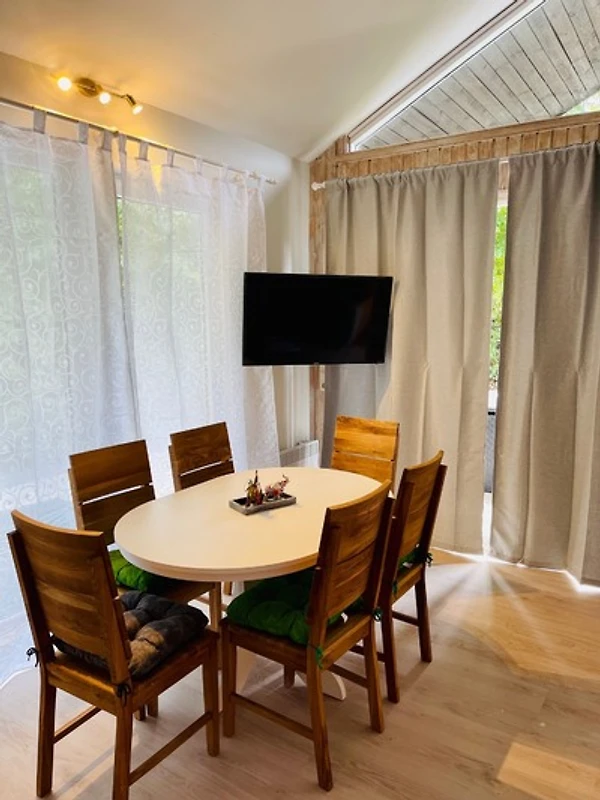 Der lichtdurchflutete Wohnraum überzeugt mit einer bequemen Sitzlandschaft, einem Essplatz für 5 Personen, grossem Smart-TV und einem Kaminofen für gemütliche Abende. Die Sitzlandschaft kann zusätzlich als Schlafgelegenheit genutzt werden.