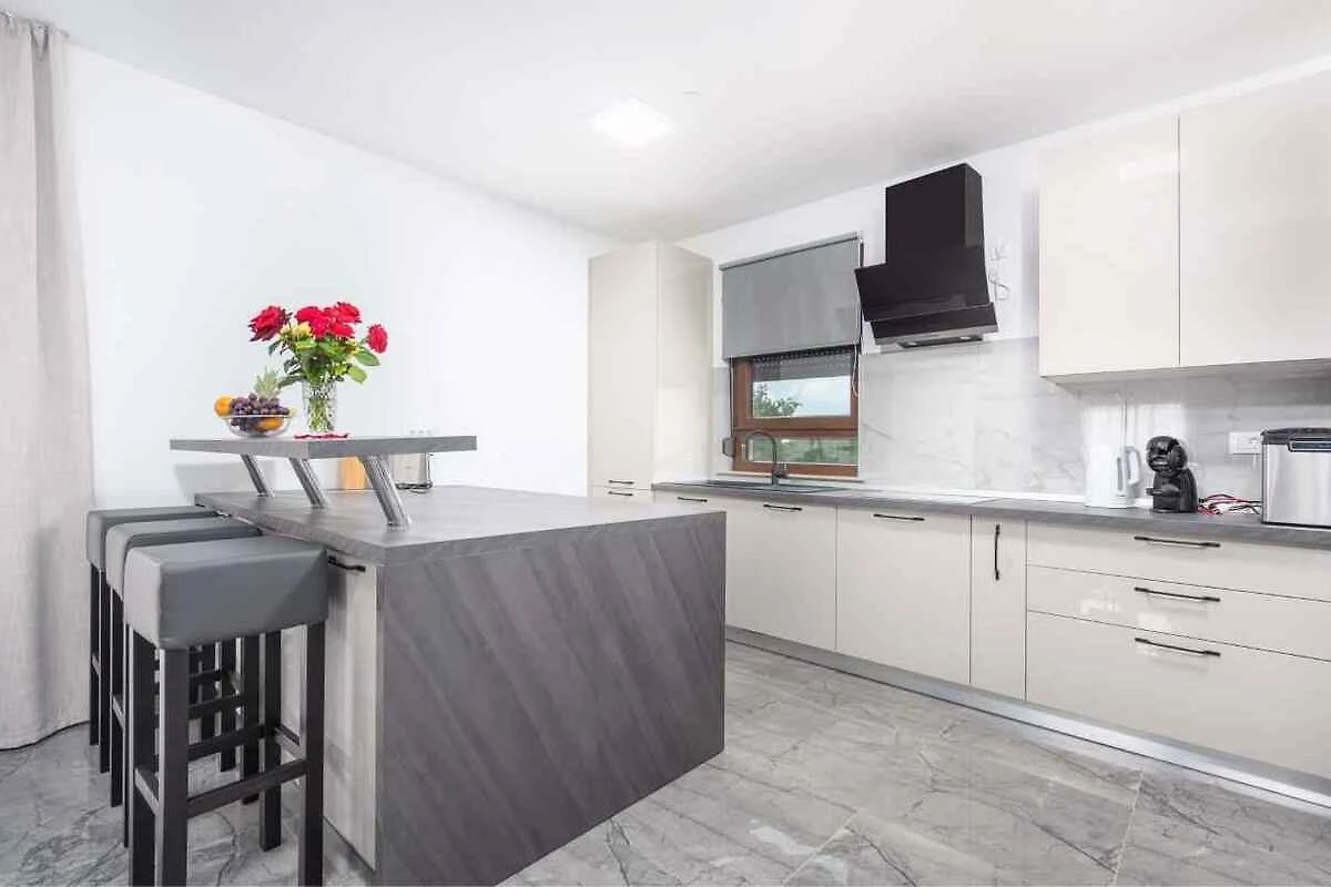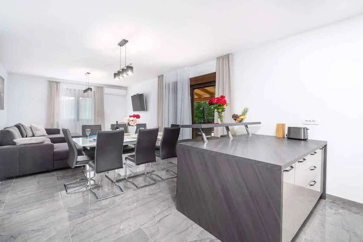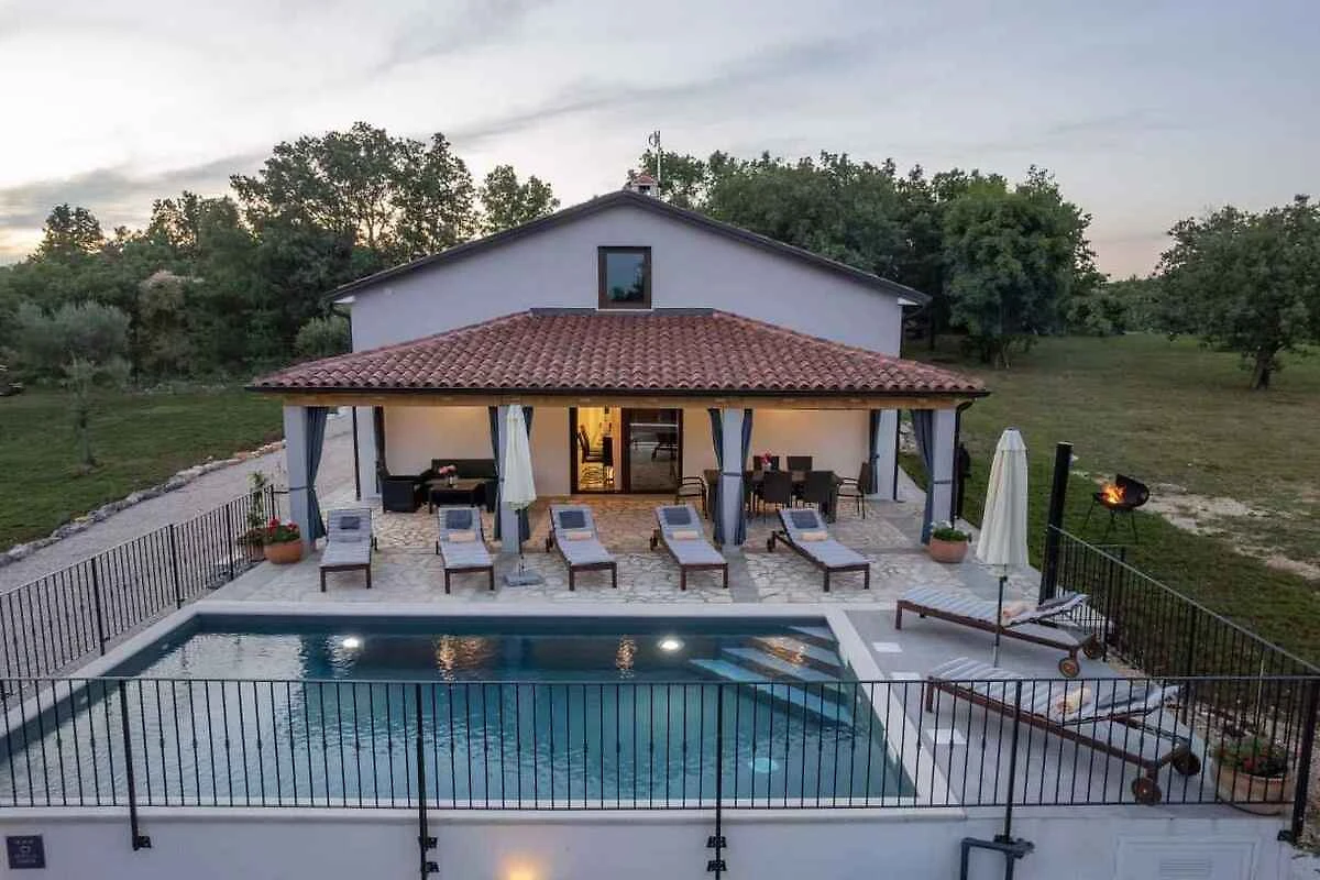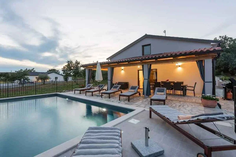 Buje. Das Ferienhaus befindet sich auf einem geschlossenen Gartengrundstück mit Wiese, Blumen, Sträuchern und Bäumen, von einem Zaun und einer Hecke begrenzt. Der Vermieter wohnt nicht im Haus oder auf dem Grundstück. Die Zufahrt erfolgt über einen Weg (asphaltiert). Im Winter sind Schneeketten empfohlen.