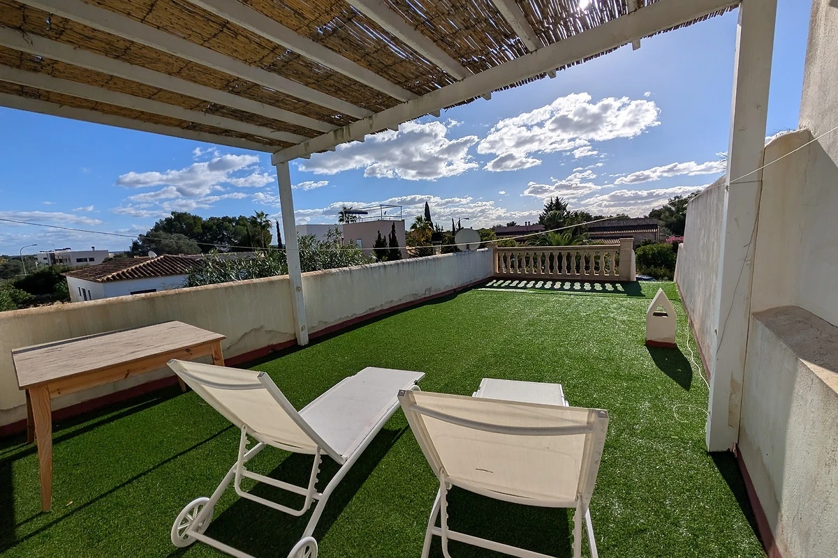 Die Veranda in Verlängerung des Wohnzimmers bietet angenehmen Schatten an Mallorcas sommerheißen Tagen.