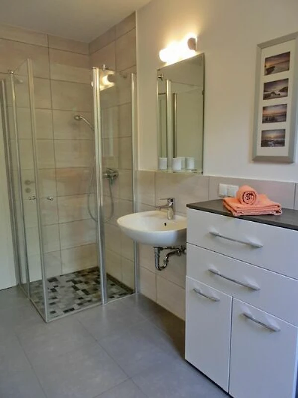 - Das moderne Tageslichtbad bietet neben Dusche mit ebenerdigen Einstieg und WC genügend Ablagefläche.
