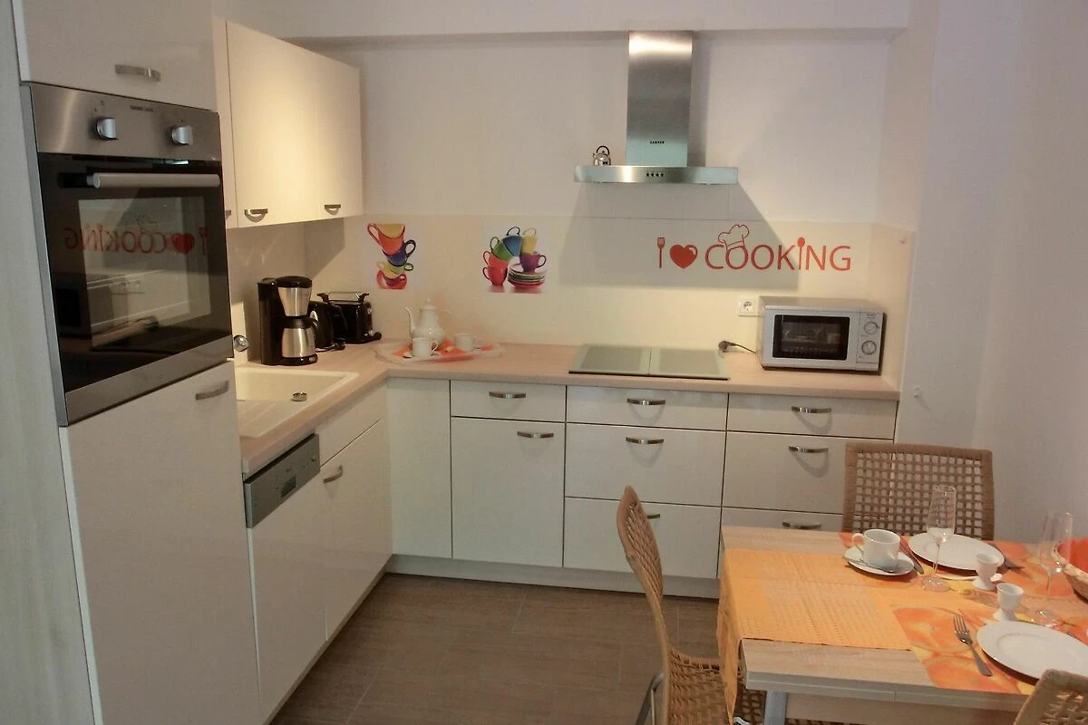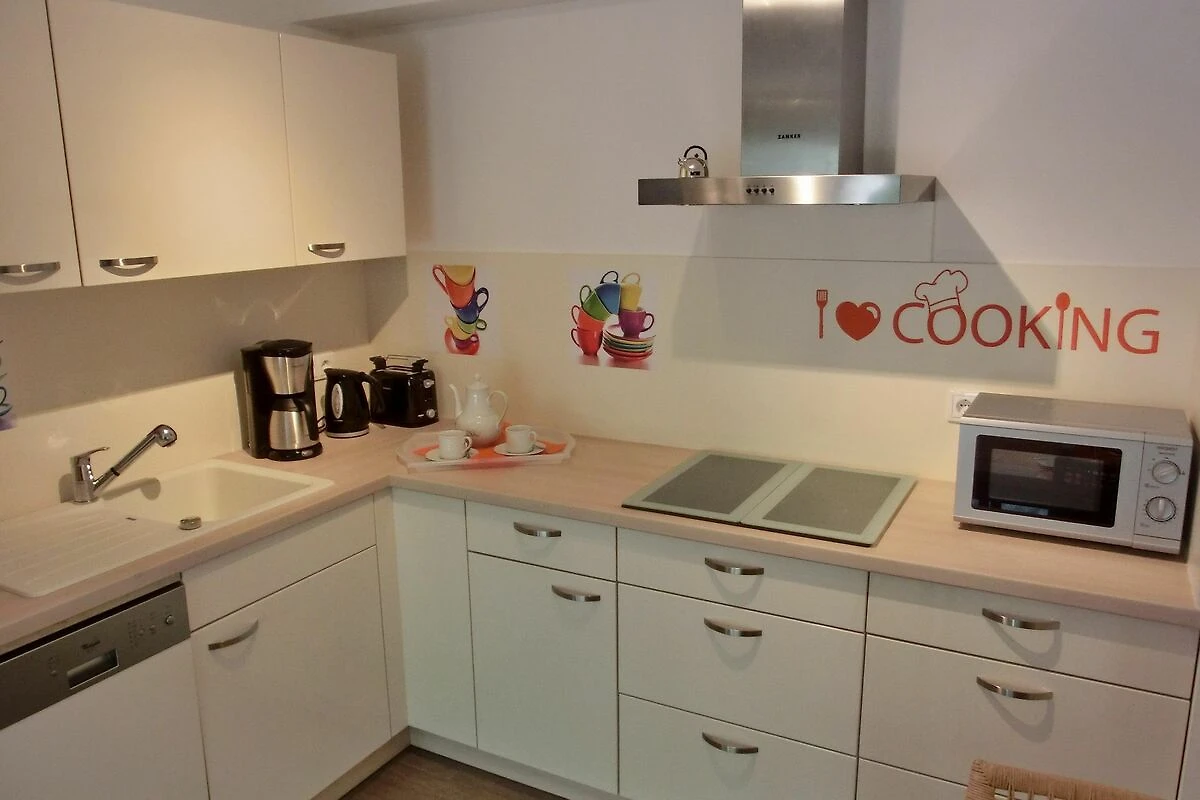 - offene, gut ausgestattete Küche inkl. Geschirrspülmaschine, Herd, Backofen, Mikrowelle, Kühlschrank mit kleinem Gefrierteil, Kaffeemaschine, Wasserkocher, Toaster, Geschirr, Besteck und Gläser ausreichend vorhanden