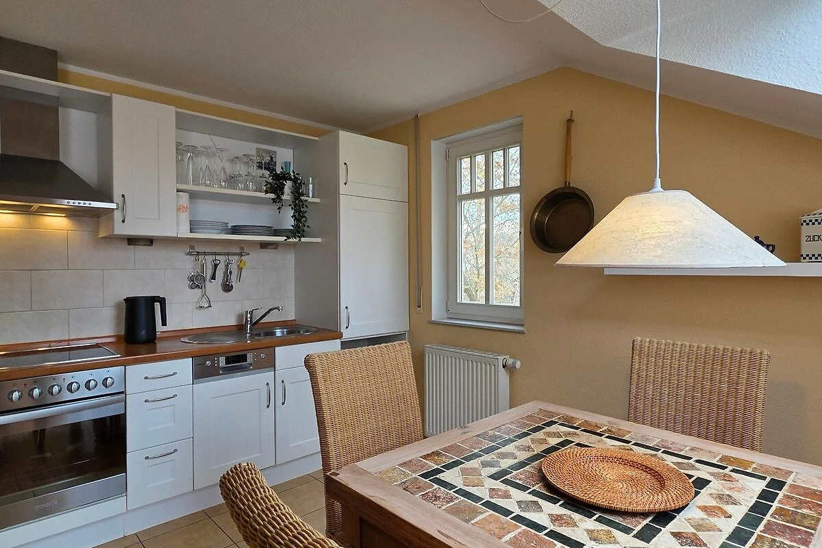 - offen Küche im Wohnbereich mit Ceranherd, Backofen, Geschirrspülmaschine, Kühlschrank mit sep. Gefrierschrank