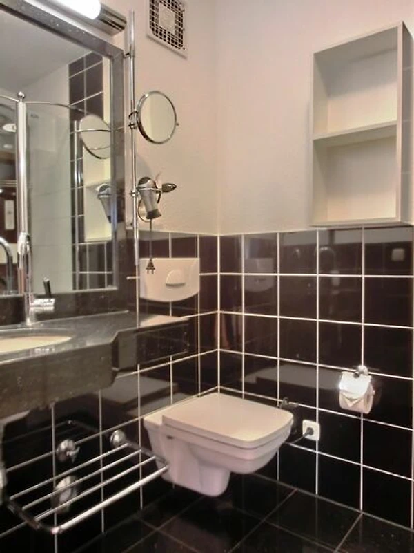 Ein modernes Badezimmer mit Dusche, Waschbecken, WC und genügend Ablagefläche sorgt für zusätzlichen Komfort.