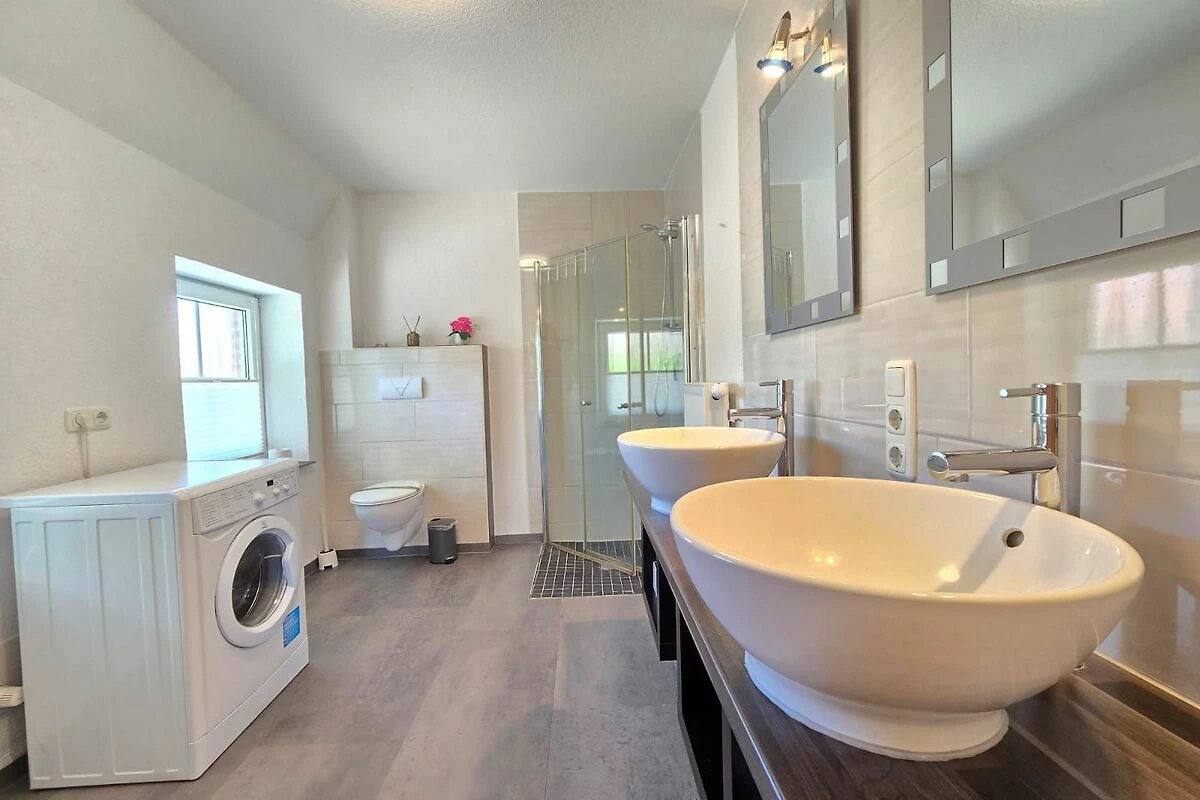 Das Badezimmer im Erdgeschoss ist hochwertig ausgestattet und verfügt über:
